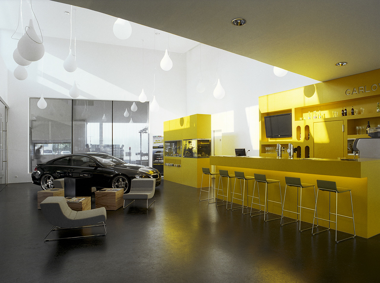 Spannender ist es aber sicher, in der Lobby bei einem Espresso auf das Auto zu warten, und durch die Glaswand die automatischen Bürsten, Wasserstrahlen und Sprühregen im Gegenlicht zu beobachten, die dem Raum eine lebendige Atmosphäre verleihen. (Text: Martin Grabner)