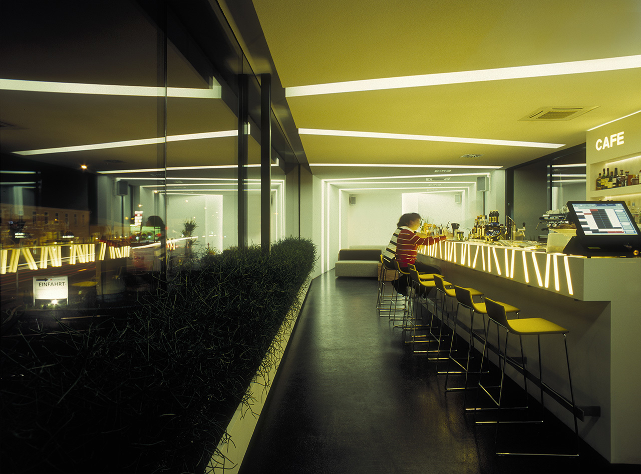 Im auskragenden Obergeschoß befindet sich eine Bar, die auch getrennt von der Autopflege begehbar ist. Sie bietet neben dem Panoramablick über die Triesterstraße und Einblicken in den Reinigungsbetrieb auch ein sonniges Atrium, in dem sich ein Frühstück genießen lässt, während unten das Auto gewaschen wird.