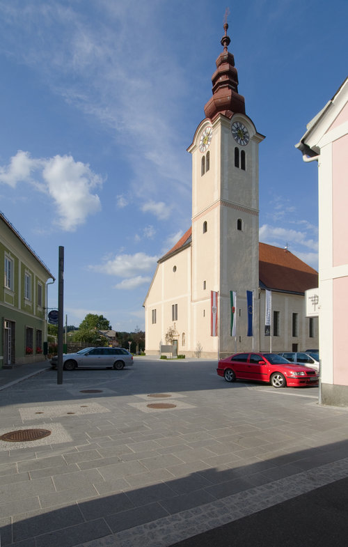 Die Gehsteige um die Kirche sowie entlang der Häuser sind mit einem Randstein aus hellen „Neuhauser“ Granit markiert und mit einer Höhendifferenz von 3 cm zur Fahrbahnfläche ausgebildet. Diese dient als Trennung zu den Stellplätzen und ist somit auch barrierefrei.