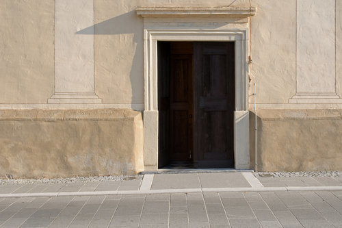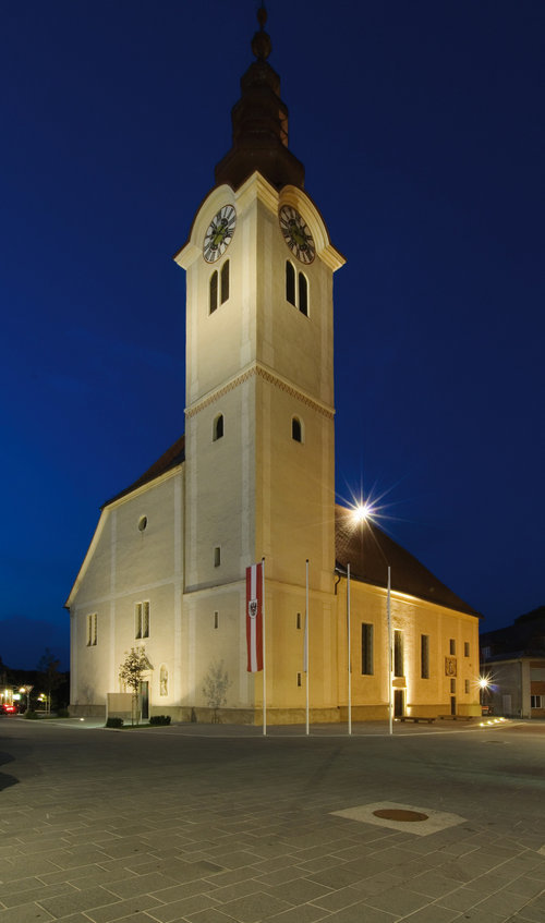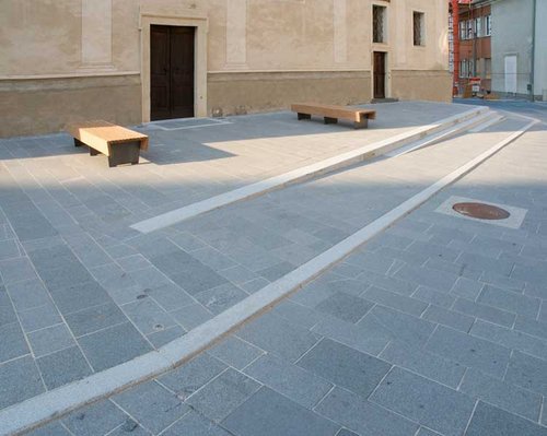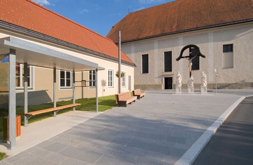 Das Niveau an der Südfassade der Kirche wurde beibehalten. Der Niveauunterschied zwischen Kirche und abfallender Fahrbahn in Richtung Schule wurde mittels verlaufenden Blockstufen aus „Neuhauser“ Granit aufgenommen.
