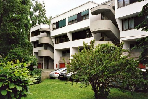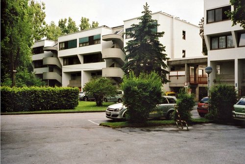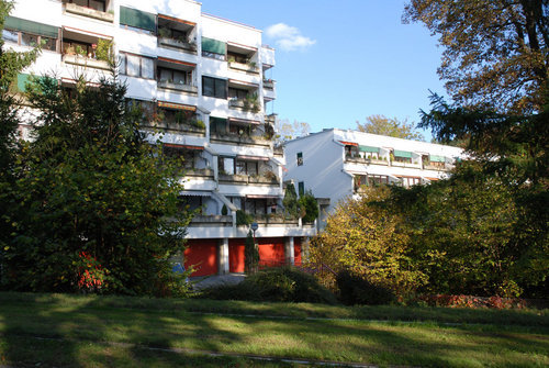 In dem 5-geschossigen und dem 3-geschossigen Wohnbau sowie den zwei Reihenhäusern sind insgesamt 53 Wohnungen untergebracht. Die einzelnen Trakte sind im Erdgeschoss über einen durchlaufenden Laubengang verbunden, der über eine für die Feuerwehr erforderliche Hebebrücke führt. Unter dem Erdgeschoss befinden sich Garagen und die zentrale Tiefgarage.