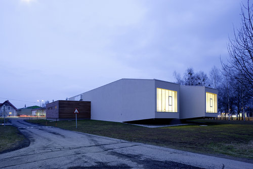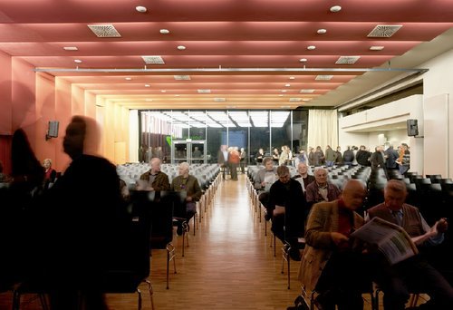 Die Akustik der Halle ist für keine bestimmte Nutzungssituation konzipiert. Blaskonzerte und Kammermusik, Theateraufführung und Faschingsfest, Vorträge und Feuerwehrfest. Hier wurde der gemeinsame Nenner gesucht. Die Lichtanlage ist in 11 Programmierungen vordefiniert und kann für verschiedenste Nutzungen individuell verändert werden. Die Nebenfunktionen wie Sanitäreinheit, Lagerraum und Küche sind als Kuben an den Hallentrakt dazugestellt. Als „Versorgungsmodule“ sind sie auf die notwendige Mindesthöhe reduziert. Im Keller befinden sich Technik- und Lagerräume.