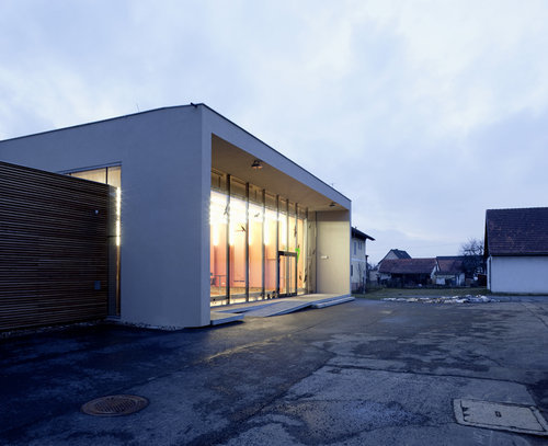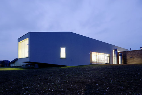 Die Halle versucht durch ihre eigenständige – nicht ortsübliche – Formensprache einen neuen Akzent im sehr heterogenen und maßstäblich nicht homogenen Siedlungsgefüge zu setzten. Als Ort für alle setzt sie sich bewusst von ihren Nachbargebäuden ab und wirkt fast wie ein „gelandetes UFO“. Die neue Begegnungshalle bietet den Anforderungen der Gemeinde eine zeitgemäße Hülle. Offen zum dörflichen Leben, das am Gemeindevorplatz mit Raiffeisenbank, Lagerhaus, Gemeindeamt und Bürgerservice stattfindet, begegnet die Halle mit ihrer transparenten Fassade den Aktivitäten der Gemeinde. Den bestehenden Birkenhain aufnehmend, öffnet sie sich auch nach Süden, um die Nutzfläche in den warmen Jahreszeiten um ein Vielfaches zu vergrößern.
