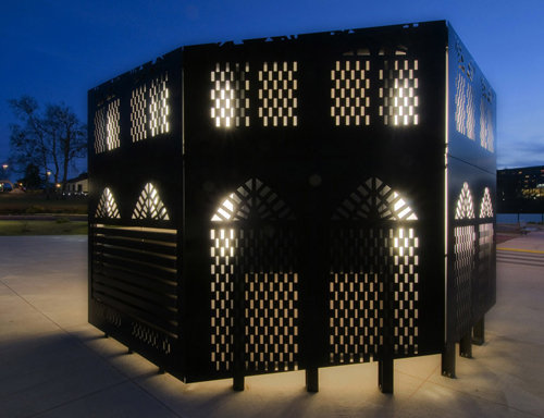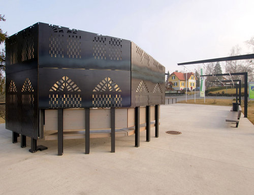 Mehrere Verkehrslösungen und entsprechende Gestaltungsentwürfe mussten verworfen werden, bevor sich die Betonplatte schließlich in das grüne Hügelland senken und der betonierte Finger das obligate Kreisverkehrsgrün durchschneiden konnte. Die dominierende Rolle als Verkehrsplatz bestimmt auch die Alltagsfunktion des Pavillons als Wartehaus, ergänzt durch ein gläsernes Pendant am anderen Ende des Fingers.