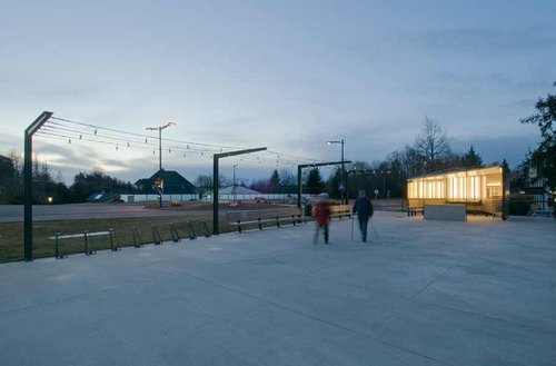 Gleichzeitig bietet die Platte mit ihren zum Aufenthalt einladenden Gestaltungselementen den einzigen Ort für Veranstaltungen in dem zur Hauptstraße hin orientierten Siedlungskern.