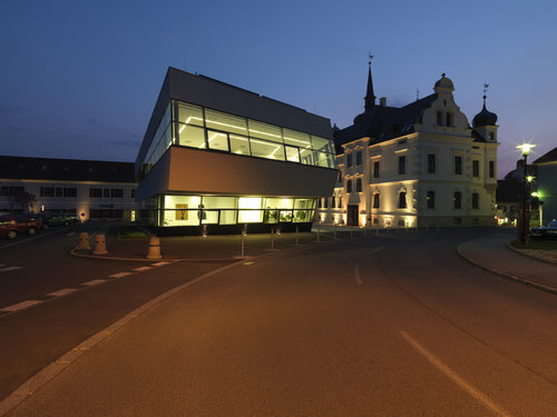 Das Obergeschoss folgt diesem Prinzip, wobei der in der Auskragung befindliche Gemeinderatssitzungssaal mit seiner sprichwörtlichen „Umsichtigkeit“ und seiner Sichtbeziehung am alten Rathaus vorbei Richtung Zentrum eine spezielle Position einnimmt.