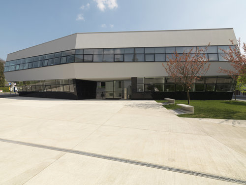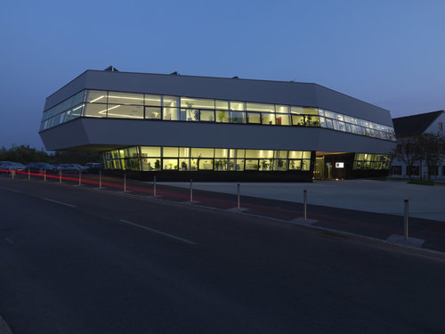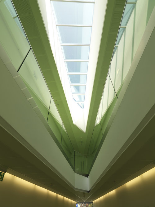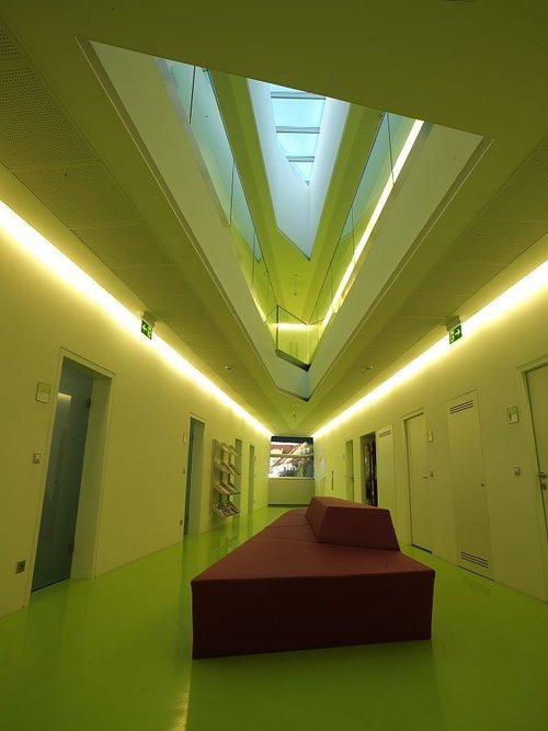 Die grundsätzlich einfache Gebäudestruktur ist im Eingangsbereich geknickt, wodurch auch im Inneren der Leitgedanke des Trichters in der Ausformung der Wartebereiche ablesbar wird. Diese Maßnahme ergibt ein großzügig wirkendes Foyer ohne zusätzliche Erschließungsflächen, das durch den vertikalen Luftraum lichtdurchflutet und kommunikationsfreundlich wird.