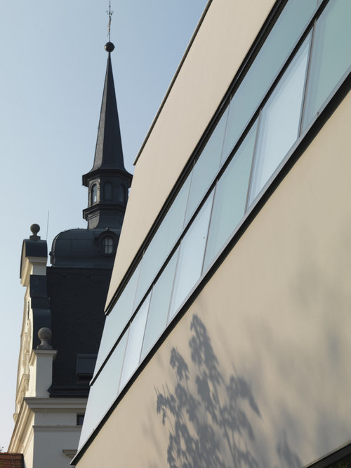 Von Südwesten her öffnet sich der trichterförmige Platz vor den Arkaden des Josefshauses. Diese Geste wird durch die Stellung des neuen Service-Centers gegenüber dem Rathaus aufgenommen und in der Baukörperausbildung variiert. Der Knick in der Horizontalen des Gebäudes wird auch in der Vertikalen aufgenommen, wodurch sich der Lichtraum des Rathausplatzes nach oben aufweitet. Durch das Hinausragen des Gebäudes bis zum Straßenraum der Rathausgasse kündigt sich das Service-Center bereits vom Florianiplatz her an, gibt dieser Blickachse einen baulichen Abschluss und bildet einen neuen städtischen Platz.