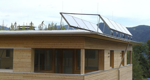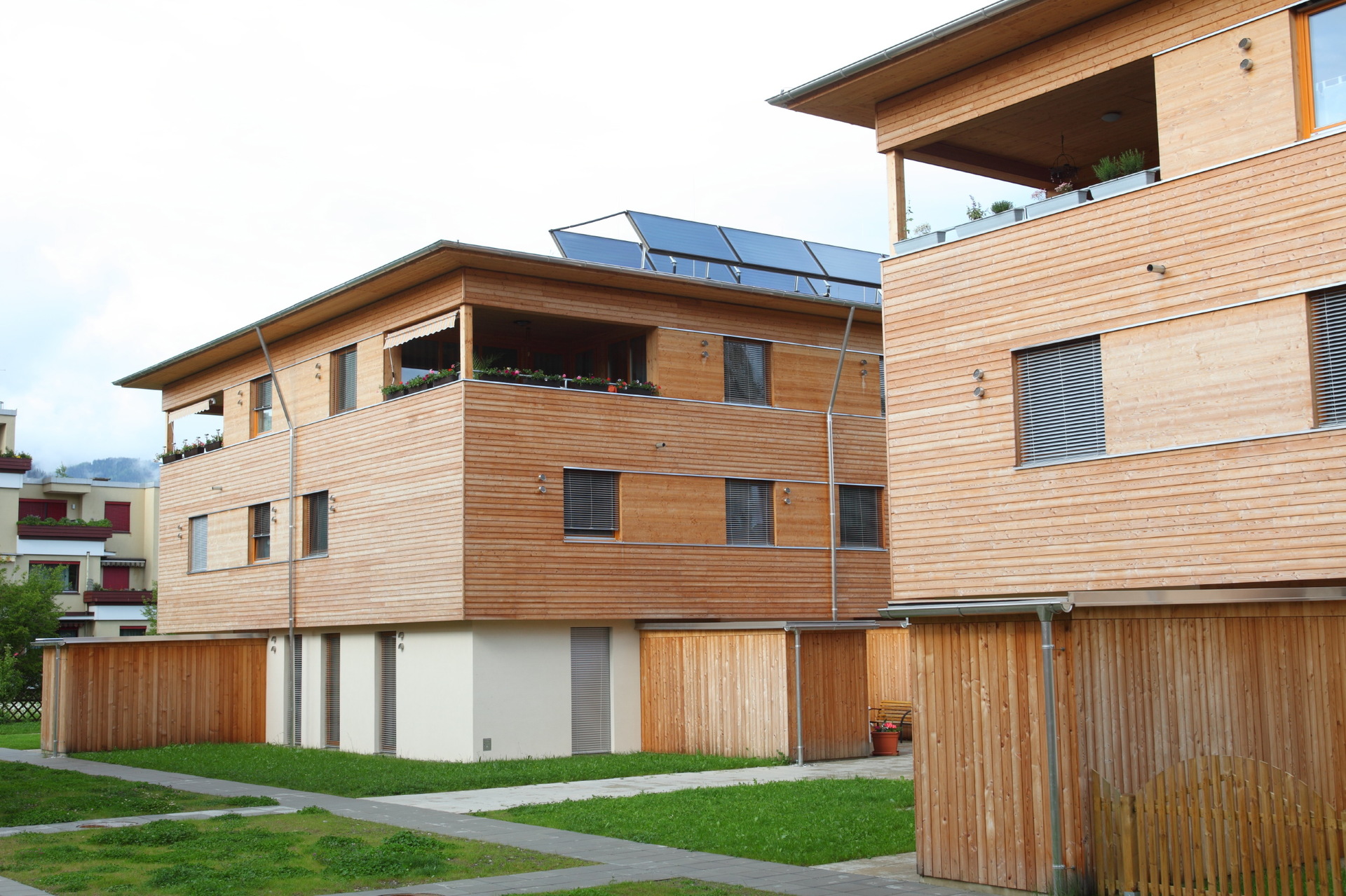 Die Nassbereiche sämtlicher Wohnungen gruppieren sich um den zentralen Kern des Hauses. So sind die Installationstrassen effizient gebündelt. Die Häuser wurden in vorgefertigter Holztafelbauweise (Massiv- und Riegelbauweise) errichtet.