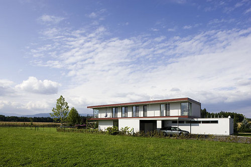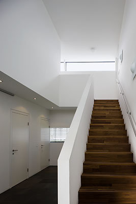 Der Zuschnitt des längsrechteckigen Grundstücks mit seinen Schmalseiten im Osten und Westen bestimmt den Grundriss der zwei Geschoße im Form von zwei Kuben, die versetzt übereinander geschichtet sind: Die Aufenthaltsbereiche des Hauses folgen dem Sonnenstand und die Abläufe des Tages werden mit der Natur in Beziehung gesetzt.