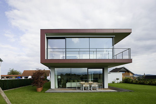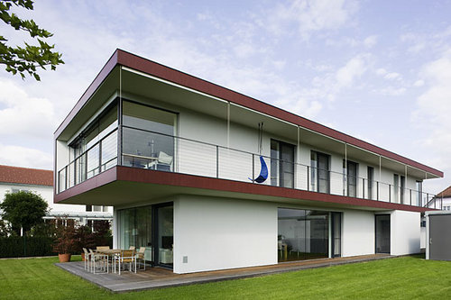 Das im Westen auskragende Obergeschoß bietet baulichen Schutz vor direkter Sonneneinstrahlung im Sommer und bildet gleichzeitig großzügige Terrassenflächen entlang des Gebäudes. Die dem Obergeschoß die ganze West- und Südseite umlaufende, überdachte Terrasse erweitert die dahinter liegenden Zimmer und bietet mit der Möglichkeit der Beschattung mit Sonnensegeln einen viel genutzten Übergangsraum von innen nach außen.