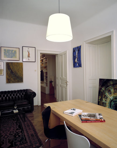 Der Grundton Weiß dominiert die Oberflächen der Wohnung und schafft den entsprechenden Rahmen für Designermöbel, zeitgenössische Kunst und das antike Klavier. Gleichzeitig lässt er das Grün des Innenhofs durch die Fenster wie ein Gemälde wirken. (Nach einem Text von texterei wortgut | Andrea Rumpold-Zobl)