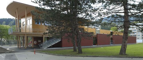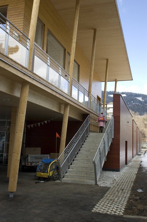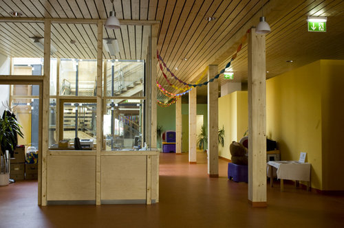 Sämtliche Gruppenräume sind zur Gartenseite in Richtung Mur orientiert, wodurch für Schule und Kindergarten ein ungestörter Betrieb möglich ist. Im Gebäudeinneren sind die Erschließungszonen in beiden Geschoßen durch differenzierte Zonierungen zusätzlich zu Spiel- und Arbeitsbereichen umfunktioniert, wodurch reine Ganglösungen vermieden wurden. Das vielfältige Raumangebot beeinflusst die Kreativität der Kinder positiv und entspricht dem ambitionierten pädagogischen Konzept.