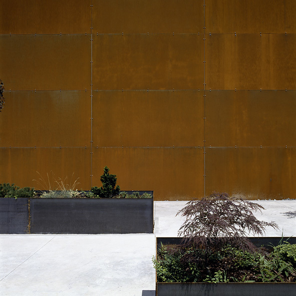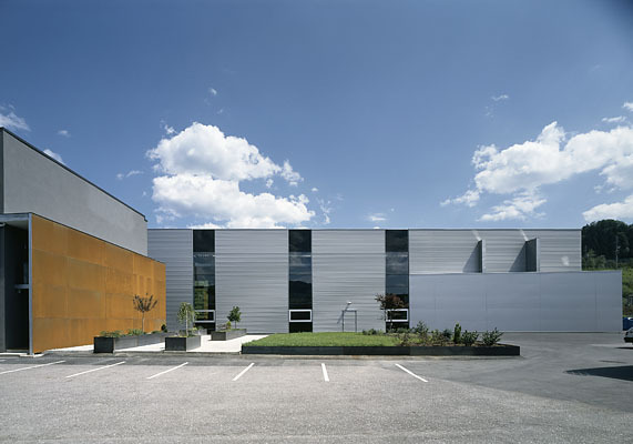 Das Bürogebäude wurde im Innenbereich funktionell an die Bedürfnisse der Firma angepasst, im Außenbereich an das Erscheinungsbild der neuen Hallen; es wurde hier ein dunkelgrauer Farbton verwendet, durchbrochen im neuen Stiegenbereich durch eine Fassade aus rostendem Stahl.