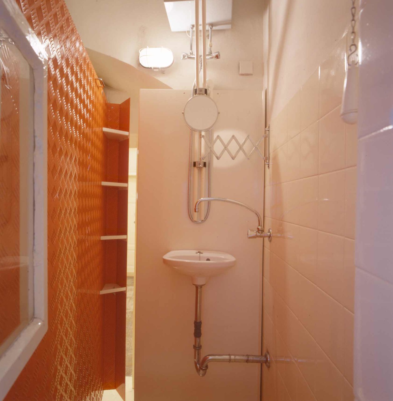 Die Raffinesse solch einfacher Lösungen wird dort augenscheinlich, wo ein Bild an einem Stahlseil hängt und so verschoben werden kann, dass es bei Bedarf, einem Vorhang gleich, das Fenster zum Laubengang verdeckt. Das Bild als Teil einer räumlichen Komposition, das auch Objekt mit Funktion ist, entspricht der Klappwand aus orangem Riffelblech im ebenfalls umgebauten Klo. Sie trennt den Raum in eine Duschzelle und einen Trockenbereich und bringt dadurch, als ästhetischen Effekt, in diesen schiefwinkeligen Restraum Klarheit und Strenge der Geometrie. Doppelbedeutungen dieser Art charakterisieren Heinz Wondra mehr als Worte zur Person.