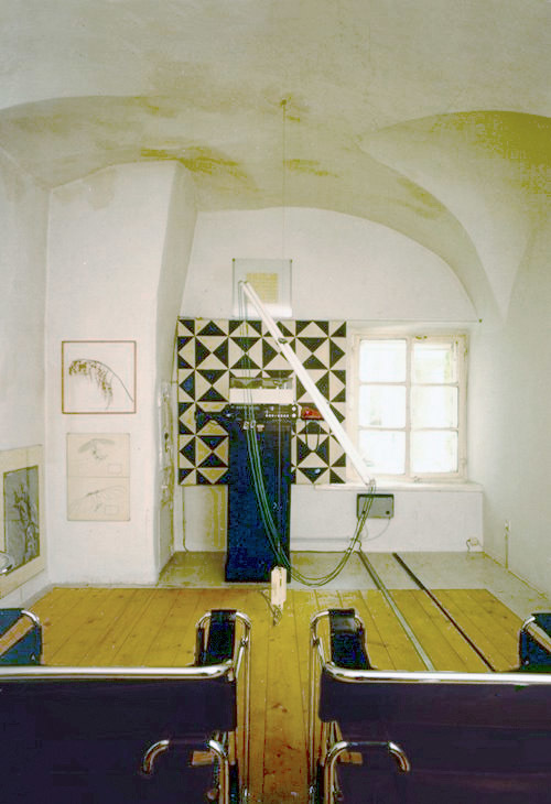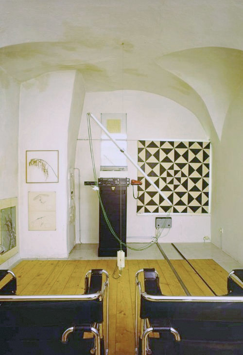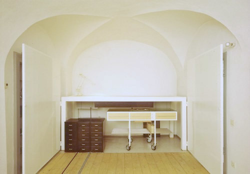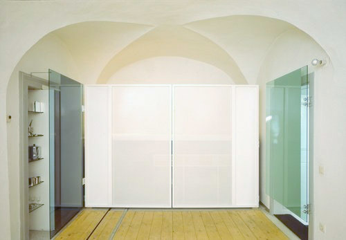 Ein überdimensionierter Stahltisch füllt fast bis auf halbe Raumhöhe eine Breitseite des Raumes. Er ist gleichermaßen Liegestatt wie Bergemöbel für Stahlcontainer auf Rollen, für einen Fernsehapparat, der entlang einer Schiene in den Wohnraum geschoben werden kann und eine fahrbare Küche in Form eines Stahltisches mit in einer Glasplatte eingelassenen Kochmulden. All das befindet sich hinter einem zweiteiligen, türhohen Paravent aus weiß gestrichenem Stahlblech und kann nach Bedarf und nach der Anzahl der Gäste beliebig herausgeschoben werden. So weit, so funktionell - nicht aber bei Wondra; bei ihm bilden die beiden Elemente des Paravents mit zwei rechtwinkelig dazugestellten getönten Glasplatten, die einem Stahlregal und der Eingangstüre vorgehängt sind, eine Art Tryptichon. Die geschlossenen Tafeln lassen das Dahinterliegende diffus durchschimmern und geben dem Raum einen fast weihevollen Abschluß. Sind sie geöffnet und damit jeweils vor die anderen geklappt, deuten ihre Kanten einen Fluchtpunkt jenseits des perspektivisch erweiterten Raums an.
