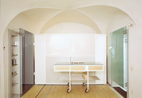 Laubengangwohnungen stellen den Archetypus städtischen Wohnens dar. Der Architekt Heinz Wondra wollte sich in Büronähe eine fallweise zu benützende Bleibe schaffen und er hat daher einen Raum seines Büros im Hofhaus eines Renaissancepalais in der Grazer Innenstadt zur separierten, kompakten Einraumwohnung umgestaltet - mit einem zur Sanitärzelle aufgewerteten Klo am Laubengang.Ein ehemaliger Wirtschaftsraum an einem spätgotischen Laubengang, knapp 24 m² groß, sollte zum persönlichen Lebensbereich werden. Nicht vordergründig das Kappengewölbe, die Nischen und die schiefen Wände bestimmen die Entwurfsidee, sondern der Respekt vor 450 Jahren verschiedenster Nutzung - vor der Geschichte der Wände - die sich in Schichten übereinander ausdrückt. Der Raum wird in seiner Ganzheit nicht angetastet, jeder Eingriff erfolgt mit Distanz zu den bestehenden raumbildenden Elementen.