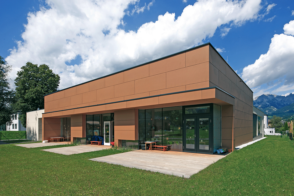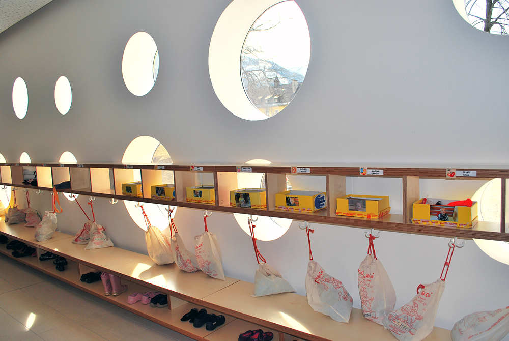 Die zentrale Anordnung und die verglasten Bauteile ermöglichen eine gewisse Transparenz sowie eine leichte Überschaubarkeit des Kindergartens. Durch die klare Anordnung der Bereiche wird ein kompakter Baukörper geschaffen, welcher die Gebäudehülle auf ein Minimum reduziert. Die schlichte und klare Form des Kindergartens trägt wesentlich zur kostengünstigen Errichtung des Bauwerks bei.