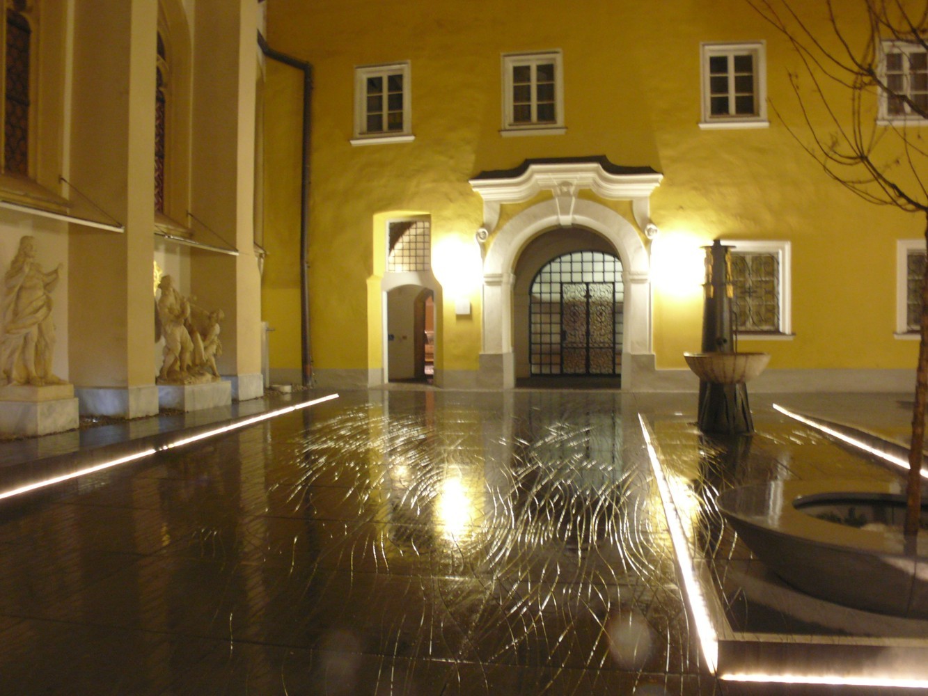 Dieser Spruch wurde in die neu verlegten Bodenplatten des Brunnenhofs in verstreuten Messinglettern eingetragen. Der Besucher kann den Spruch als eine Art meditativen Weg, als Annäherung an eine Botschaft ergehen, die auf den ersten Blick chaotisch erscheint, aber genauen Gesetzen unterliegt.
