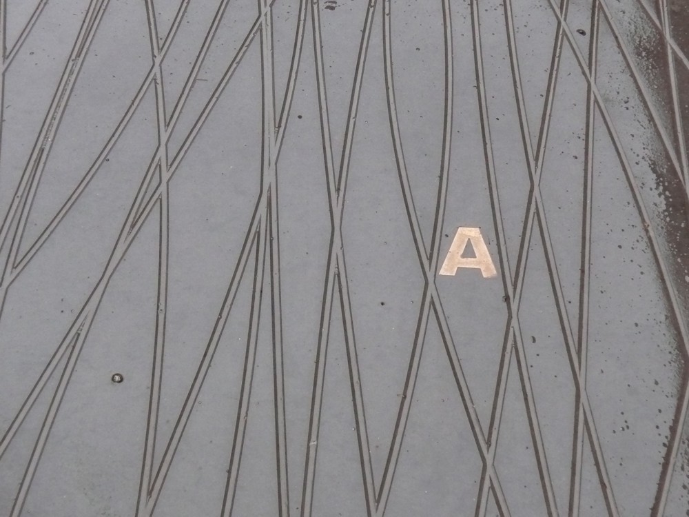 Dem Brunnenhof wird ein Quadrat aus Betonplatten als absolutes, geometrisch wahrnehmbares Objekt eingeschrieben. Diese Fläche wird mit (12x12=144) Platten gefüllt und einem Text, bestehend aus 144 Buchstaben und Zeichen bespielt.