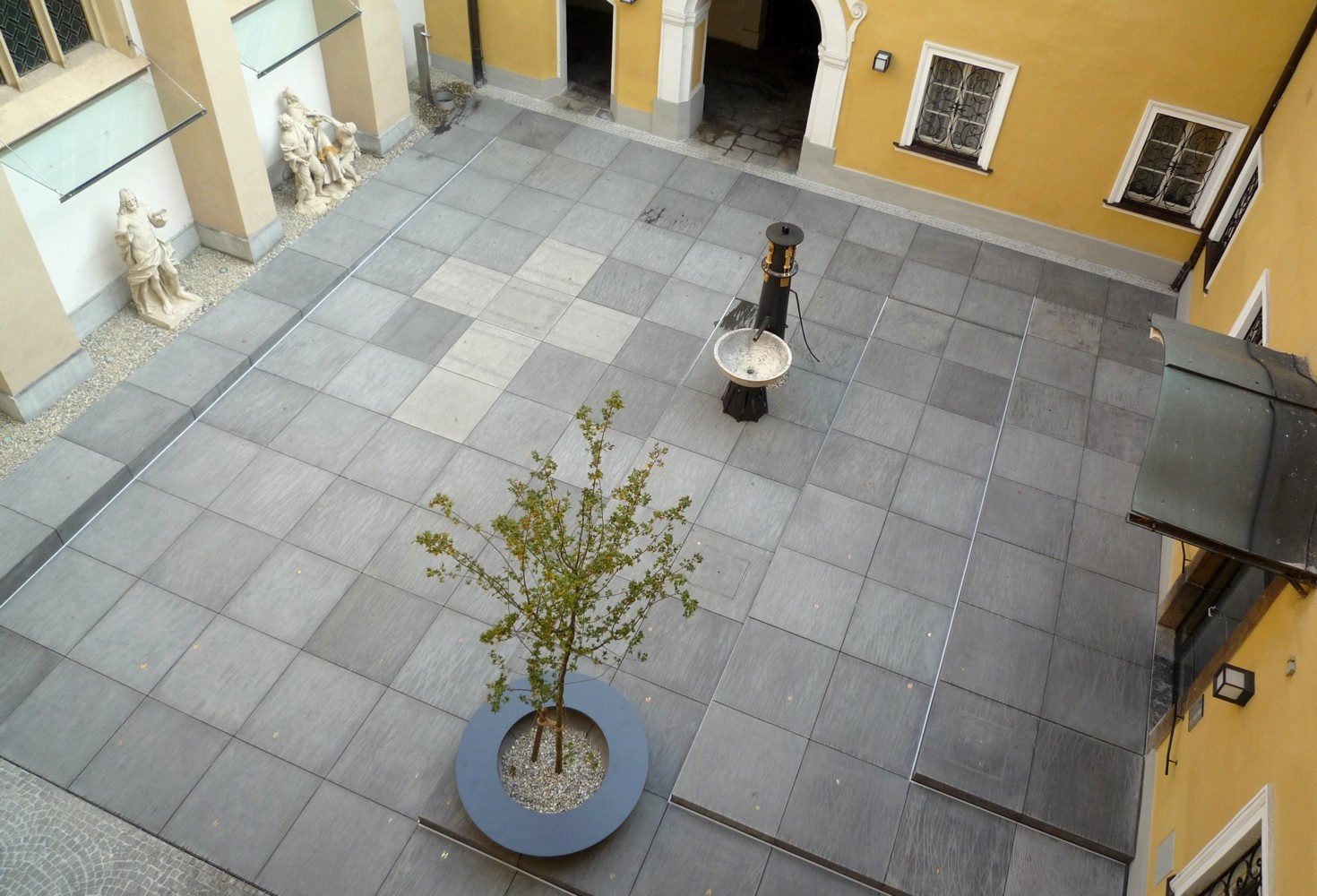 Vor diesem Hintergrund ist die Neugestaltung des Hofes Herrengasse 23 ein Versuch, ein verbindendes Element der beiden Religionen des Judentums und des Christentum zu finden und aufzugreifen, um es als spirituelles Element in die Gestaltung der neuen Hofoberfläche einzubeziehen. Gefunden wurde ein Spruch aus der Heiligen Schrift, nämlich der Segen des Aaron: "Der Herr segne dich und behüte dich.