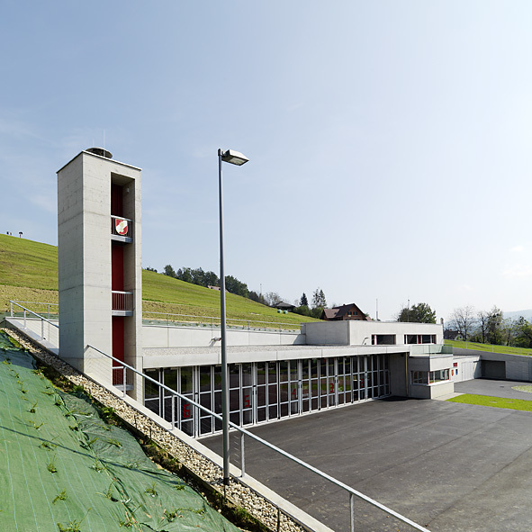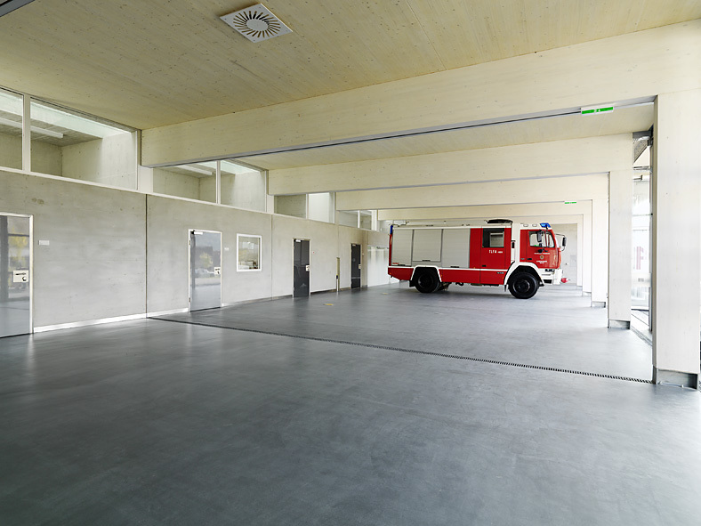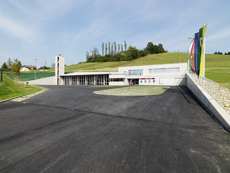 Das Feuerwehrhaus mit den flankierenden Stützmauern fasst den vorgelagerten Platz, der sich zum öffentlichen Raum - der Südsteirische Grenzstraße - hin öffnet und auch für Veranstaltungen zur Verfügung steht. Durch Grün- und Parkierungsstreifen und den vorspringenden Kommandoraum erfährt der Platz eine räumliche Differenzierung und klare Ordnung.