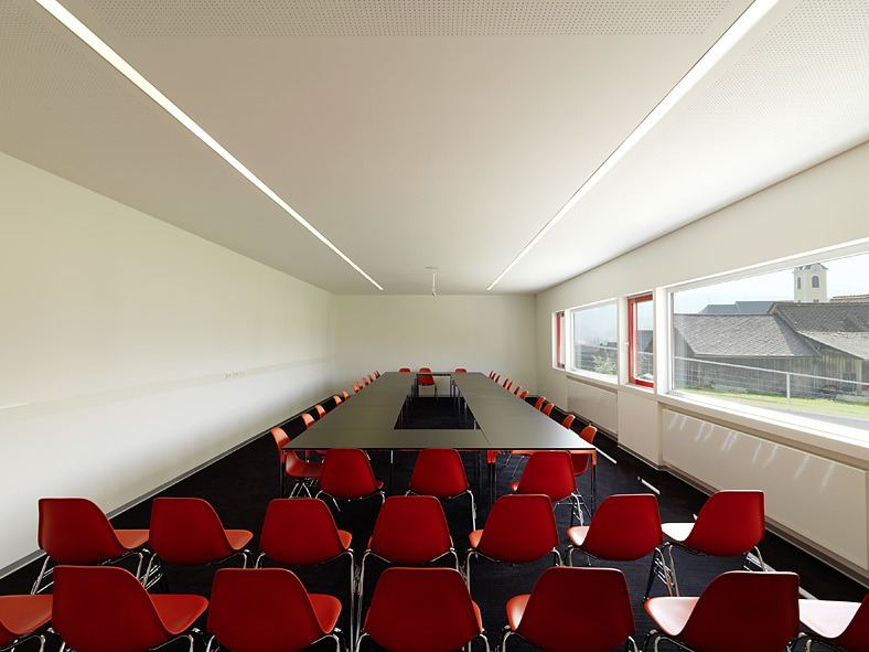 Der Baukörper setzt sich aus den unterschiedlichen Funktionsbereichen zusammen, deren Raumhöhen je nach Funktion variieren. Die einzelnen Einheiten entsprechen in Baumasse und Proportion der umliegenden Bebauung und sorgen für eine harmonische Einbindung des Gebäudes in das ländliche Gefüge.