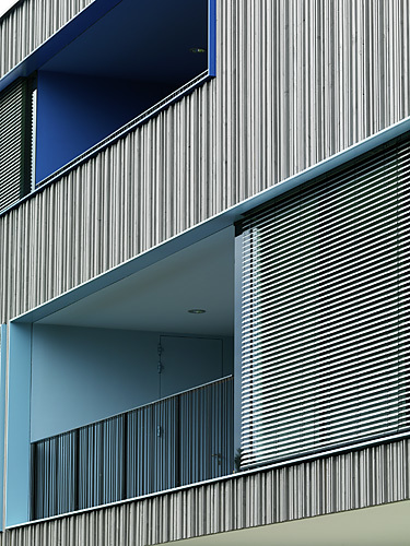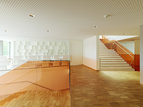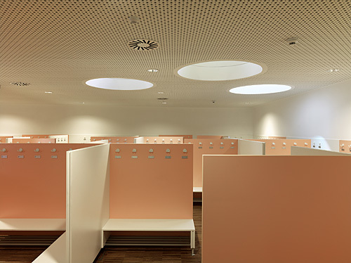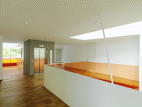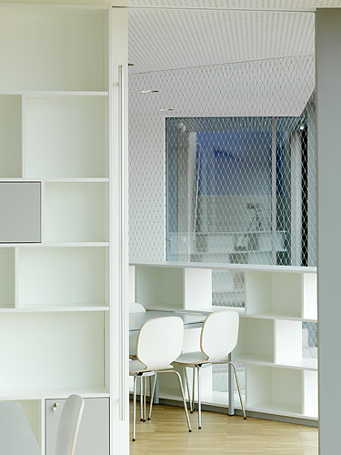 Im Erdgeschoß flankieren Speisesaal, Werkraum und die Garderoben, in die man vom darüberliegenden Pausenbereich durch glasgedeckte Sitzzylinder hinunterblicken kann, den Eingang. Ein Geschoß höher befindet sich neben Bibliotheks- und Medienraum auch die Administration mit einem Lehrerzimmer, in dem die Pädagogen in ihrer Vorbereitungszeit auch wirklich arbeiten können. Im Zentrum des Gebäudes, umspielt von den Pausenflächen, sorgt ein Lift für Barrierefreiheit.