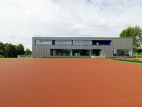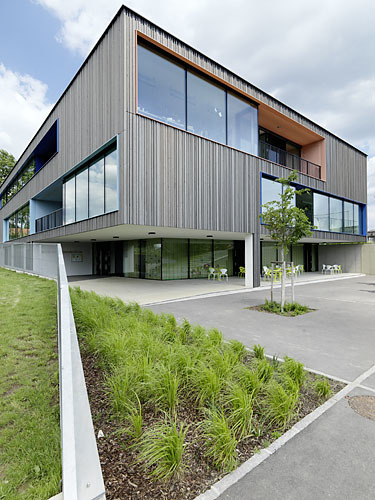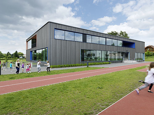 Die schon fast überstrapazierte Nachhaltigkeit wird bei diesem Projekt nicht plakativ in den Vordergrund gestellt, sondern liegt im Verborgenen: Über eine, per Tiefenbohrung gespeiste, konditionierte Be- und Entlüftung wird das Schulhaus in Kombination mit einer Fußbodenheizung temperiert. Eine Tageslichtsteuerung regelt Beleuchtung und Beschattung. Der Außenraum fungiert durch die Höhendifferenzierung, unterschiedliche Bodenbeläge und den alten Baumbestand am Bachufer selbst als Lernlandschaft.