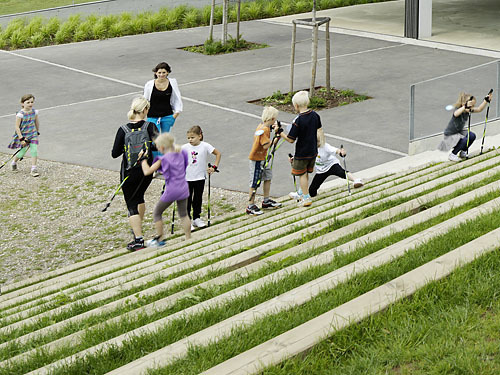 Bemerkenswert sind vor allem die großzügig bemessenen Bewegungsflächen, die sich über alle drei Ebenen ziehen. Diesem Raum, der mit vielen Nischen und schrägen Winkeln sehr bewusst aus dem orthogonalen, die Klassenräume fassenden Konstruktionsraster ausbricht, kommt im pädagogischen Konzept eine wesentliche Bedeutung zu. Hier findet klassenübergreifender Unterricht statt, wird gespielt und bei Schlechtwetter ersetzen die Flächen den Außenraum. Die Funktionsüberlagerung von Erschließungs-, Pausen- und Unterrichtsflächen unterstützt dabei die informelle Kommunikation der Kinder untereinander, aber auch mit den Lehrer:innen. Neben den Lehrenden und den Mitschüler:innen wird der Raum zum „dritten Pädagogen“. Die Treppe zwischen den beiden unteren Ebenen mit Theaterstufen und einer offenen, der Schulbibliothek zugeordneten Lesegalerie versinnbildlicht die soziale Multifunktionalität. Eine abgeschrägte Fläche am Zwischenpodest wird von den Kindern schon mal als Steilkurve interpretiert, wie die Fußabdrücke schon nach den ersten drei Schulwochen belegen. „Aber das ist ja eine Schule, kein steriles Krankenhaus“, versteht Direktorin Foller die Aneignung durch die Kinder eher als Bestätigung denn als Ärgernis.