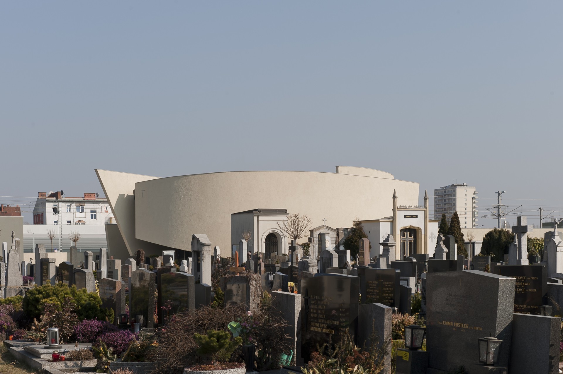 Für die Formgebung haben die Architekten nach einer passenden Symbolik gesucht und nach reiflicher Auseinandersetzung mit der Thematik, hat sich die Geste zweier ineinander verschränkter, behutsam aufnehmender Hände, die für Geborgenheit sorgt, durchgesetzt. Baulich werden die Hände durch zwei geschwungene Stahlbetonschalen umgesetzt, die den Raum aufspannen und gleichzeitig Ein- und Ausgang bilden. Auf Fenster wurde verzichtet. Neben dem großzügig verglasten Eingang sorgt ein zum apsisartigen Abschluss hin breiter werdender Lichtschlitz zwischen Decke und Wand für eine transzendent wirkende, dennoch natürliche Beleuchtung. Das erzeugte Streiflicht inszeniert im Zusammenspiel mit den ockerschlammfarbigen und grob verputzten Wänden ein warmes, angenehmes Ambiente und ist innen das einzige gestalterische Element der zurückhaltenden Architektur. Außen bietet die Halle einen prägnanten, skulpturalen Eindruck. Die Einsegnungshalle bietet ca. 100 Sitzplätze, die sich auf 180 erweitern lassen können, da der Eingangsbereich großzügig zu öffnen ist. Neben- und Serviceräume befinden sich im Ostteil und werden von einer straßenbegleitenden Wand gefasst, die im Süden einen Grünbereich beschreibt, in dem ein Urnenhain und eine Urnenwand zu finden ist. Diese weiterführende Wand und die schiere Baumasse sorgen für den besonderen Schallschutz gegen den Lärm der Bahngleise.