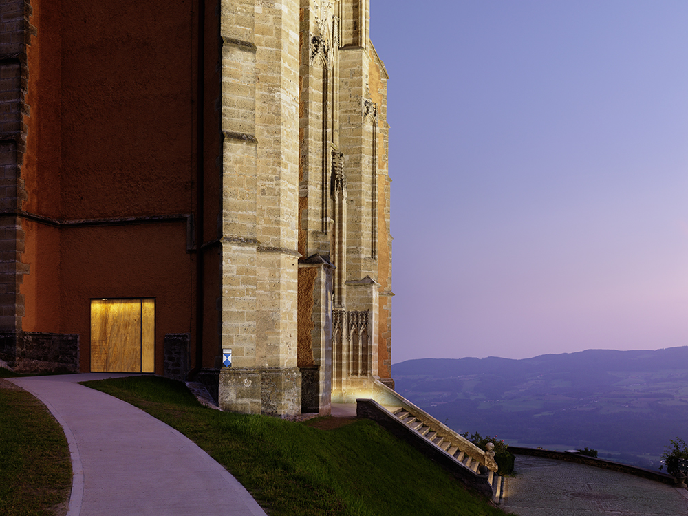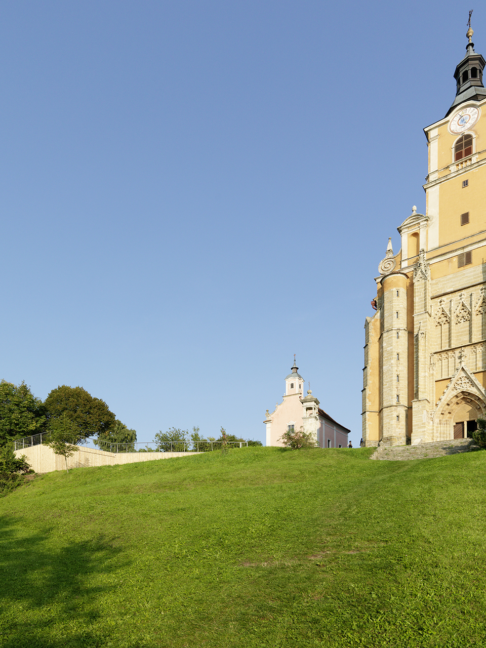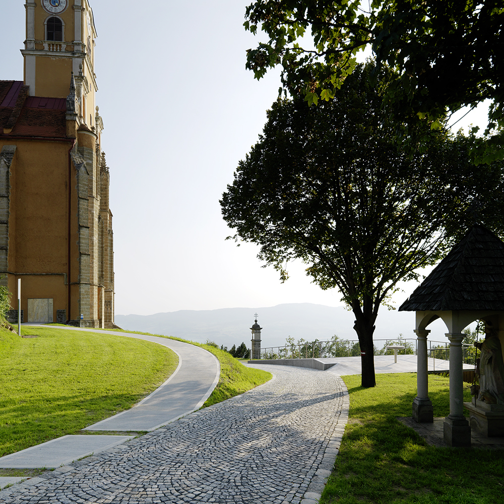 Eine besondere Feinheit in der Planungsaufgabe bot die bestehende Garage des Pfarrers. Mit einem ziegelgedeckten Zeltdach und grünen Betonwänden stellte sie eine fragwürdige „Landmark“ neben Wallfahrtskirche und Annakapelle dar. Da sich der Pfarrer auch einen Altarplatz im Freien wünschte, konnte das Ziegeldach abgebrochen und eine dafür geeignete Versammlungs- und Aussichtsfläche auf der Garage geschaffen werden. Garage, Garagentor und Stützmauer wurden hinter einer vertikalen Lärchenlattung verborgen, die - erst einmal vergraut - im Bild der Landschaft aufgeht. Die neue Wegeführung wurde so gelegt, dass sie die Aussichtsfläche, die einen schönen Blick auf Landschaft und Kirche bietet, mit einbindet.