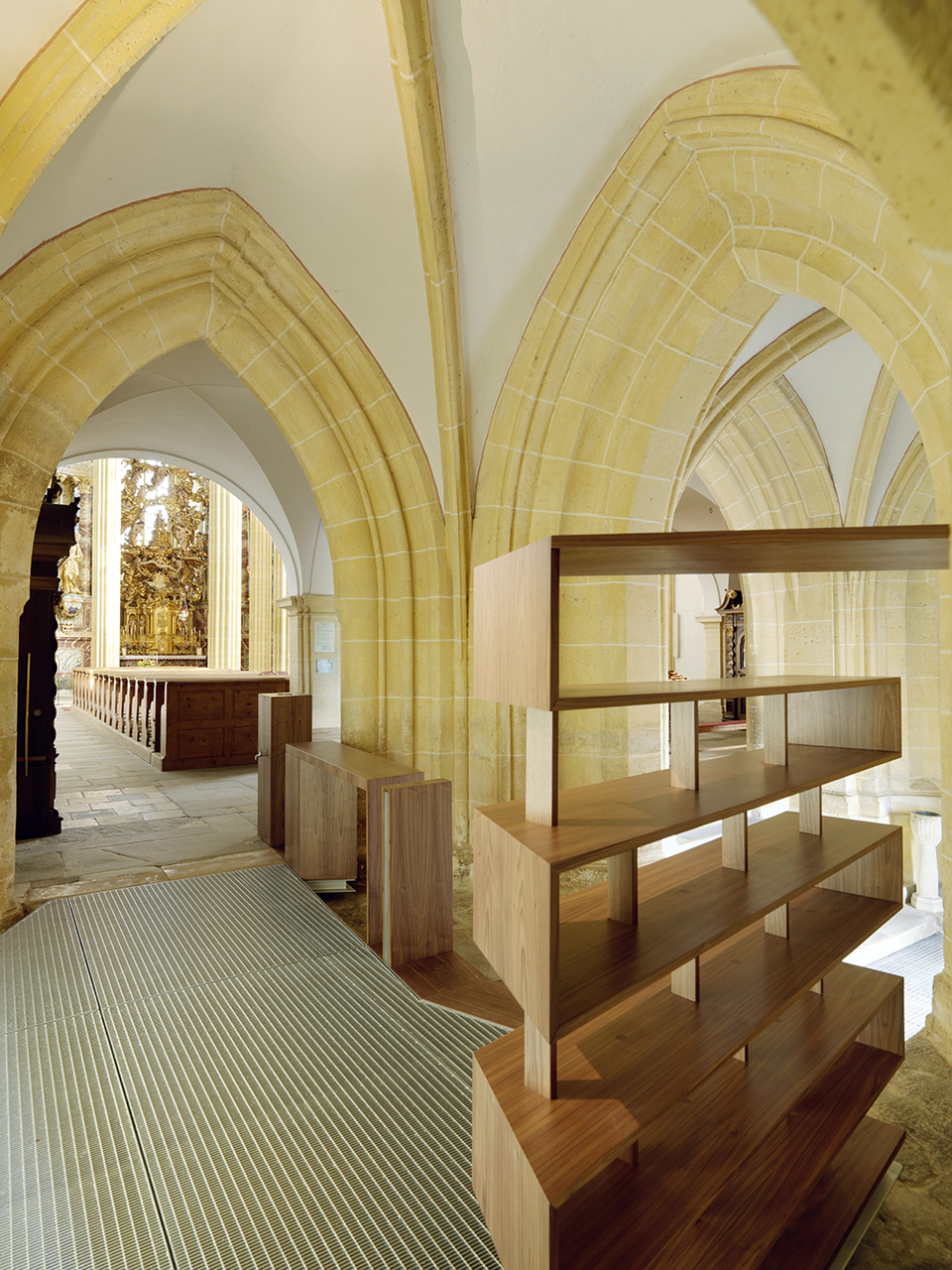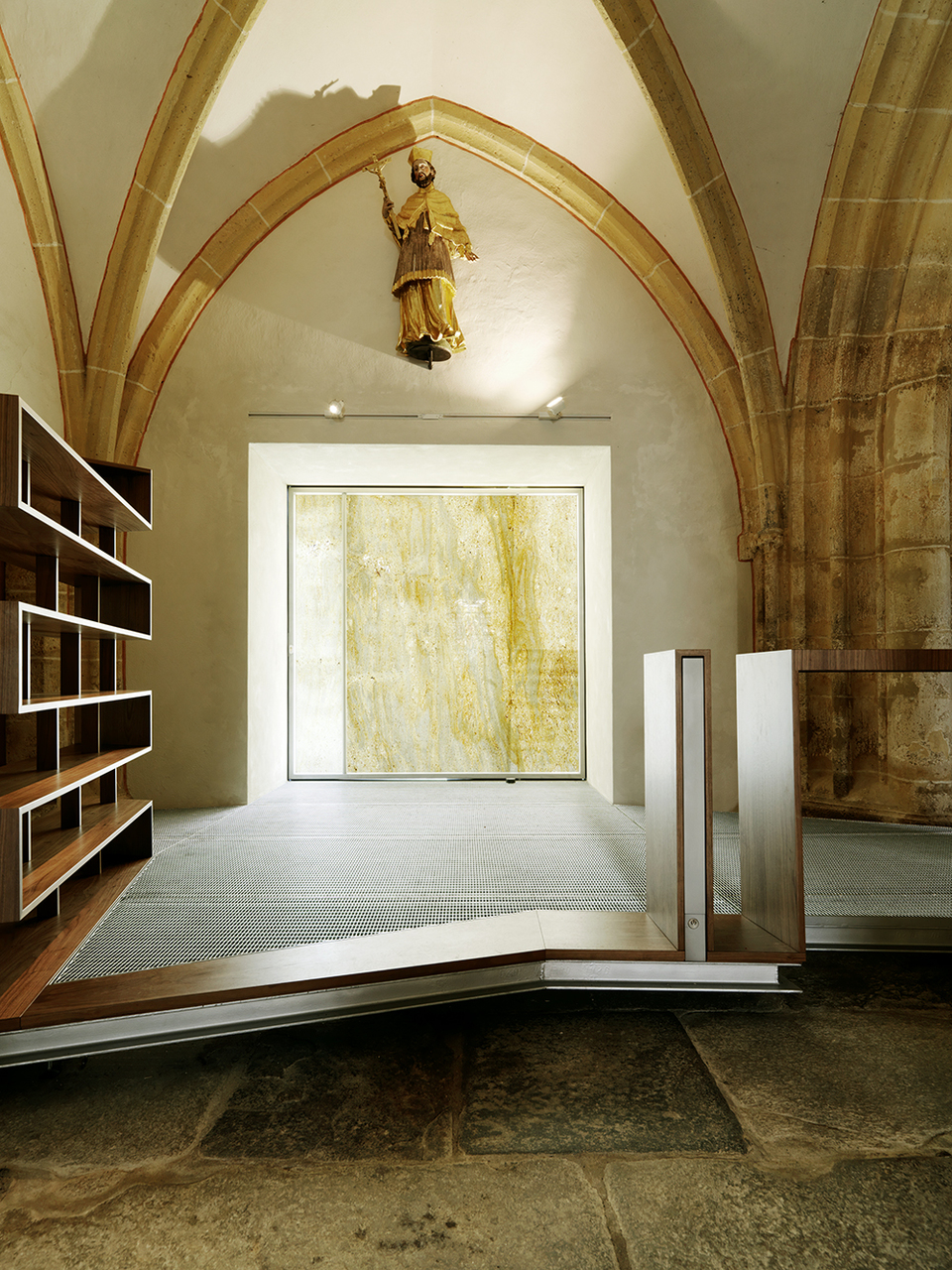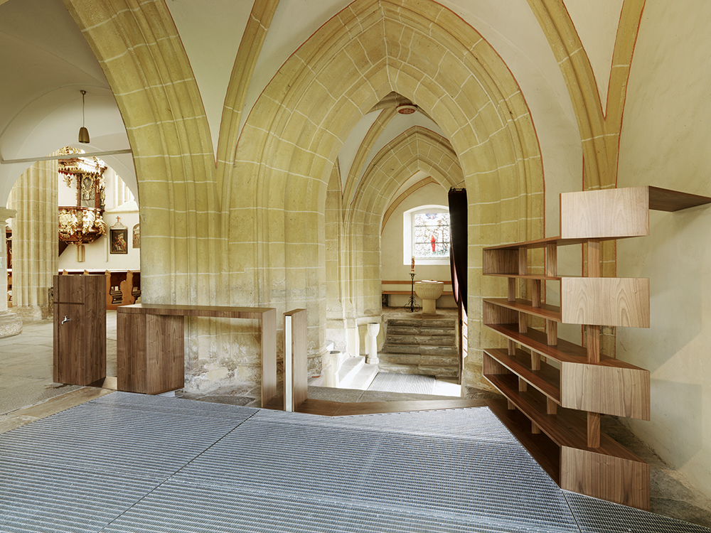 Das neue Kirchenportal musste eine gewisse unaufdringliche Prägnanz in der abstrakten, fensterlosen Kirchenfassade gewinnen, durfte aber nicht das Hauptportal konkurrenzieren. Es wurde aus einem Verbundelement aus Sicherheitsglas und einem aufgeklebten, 0,8 mm starken Natursteinfurnier ausgeführt. Dieses wirkt tagsüber von außen wie massiver Stein. Von innen ist die Wirkung vergleichbar einem Kirchenfenster aus farbigem Glas. Im Bereich des Nebeneingangs konnten die Niveauunterschiede durch einen Gitterrostboden ausgeglichen werden. Die nussfurnierte Möblierung - Schriftenstand, Weihwassergefäß und Opferstock - nimmt das Thema des „Weges“ auf und führt den Eintretenden meanderartig in das Kirchenhauptschiff. (Text: Architekt)