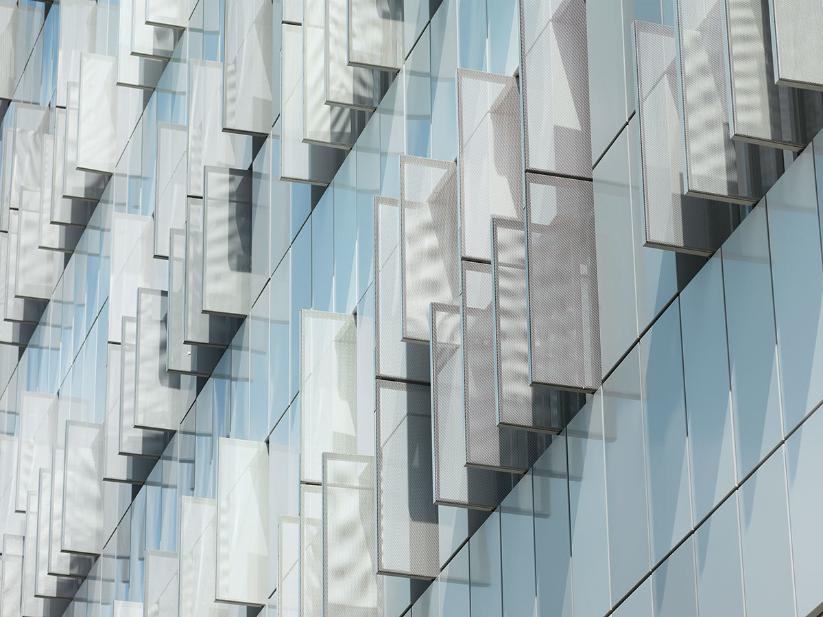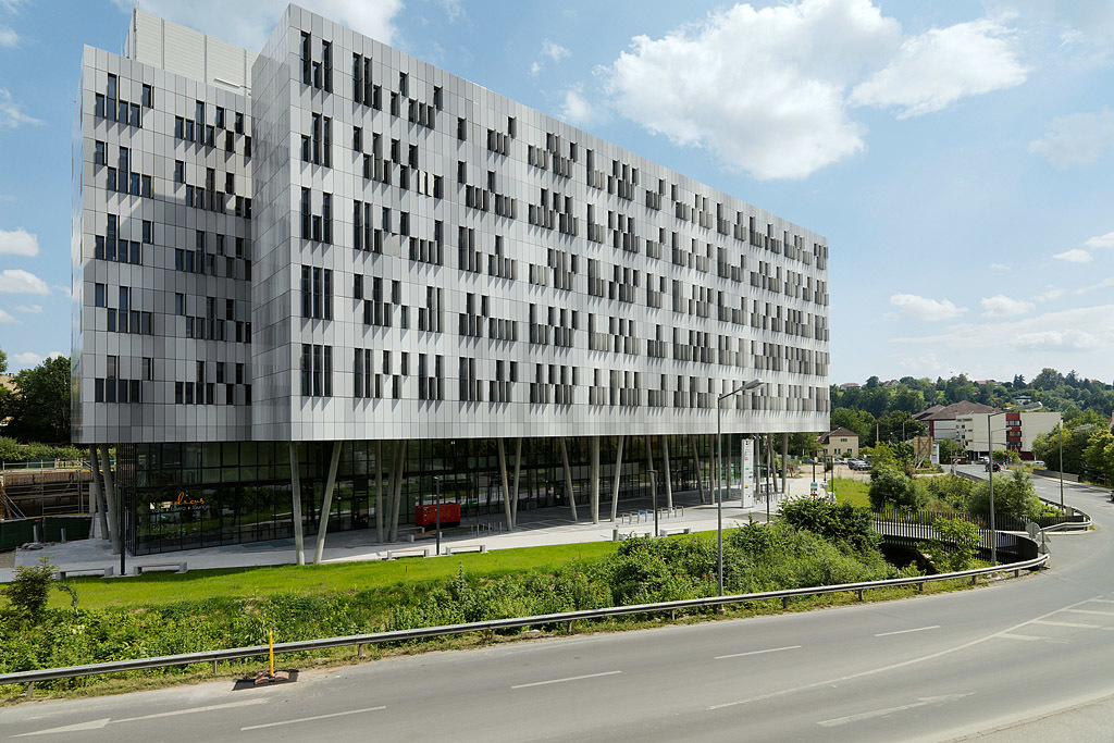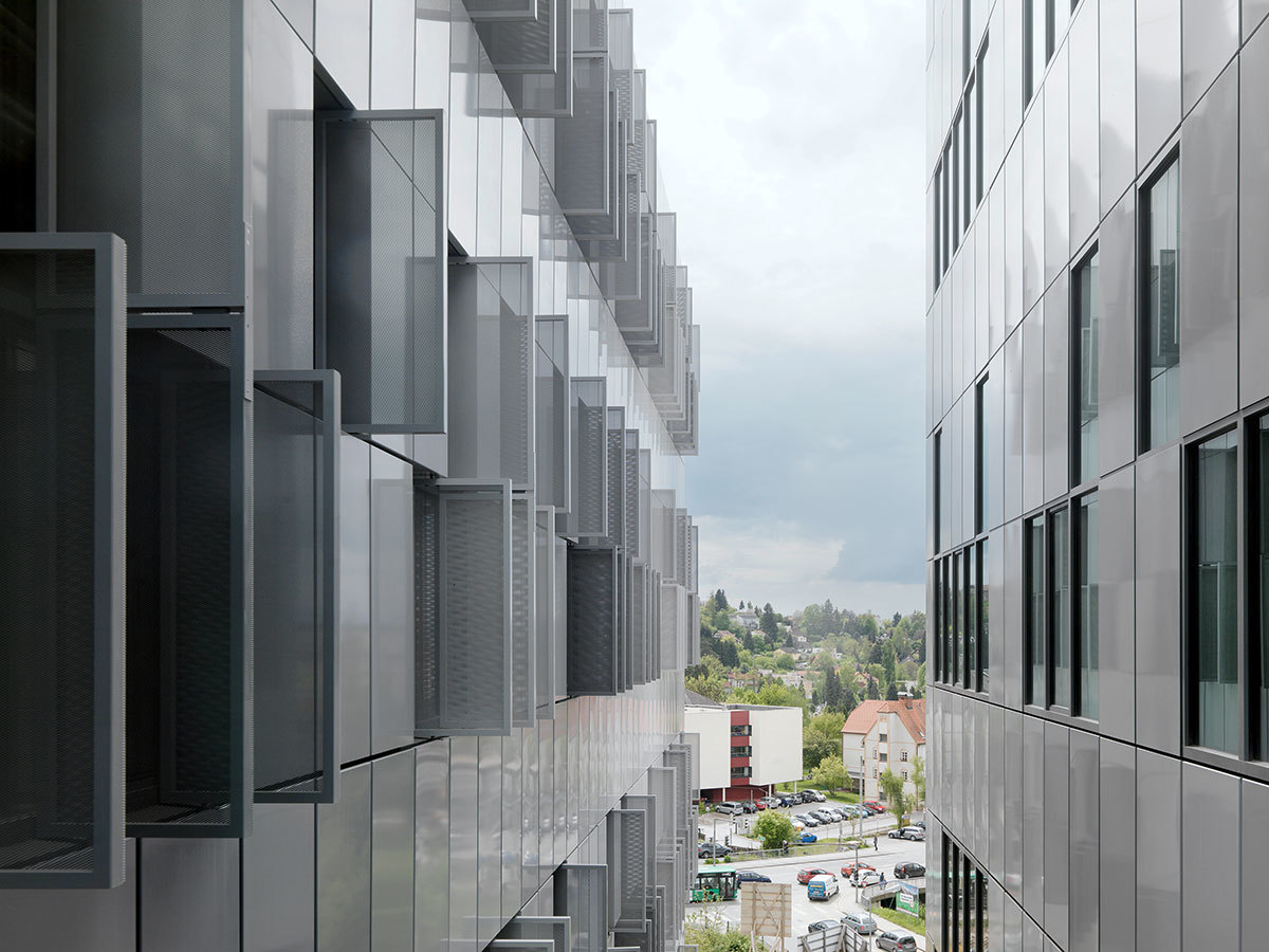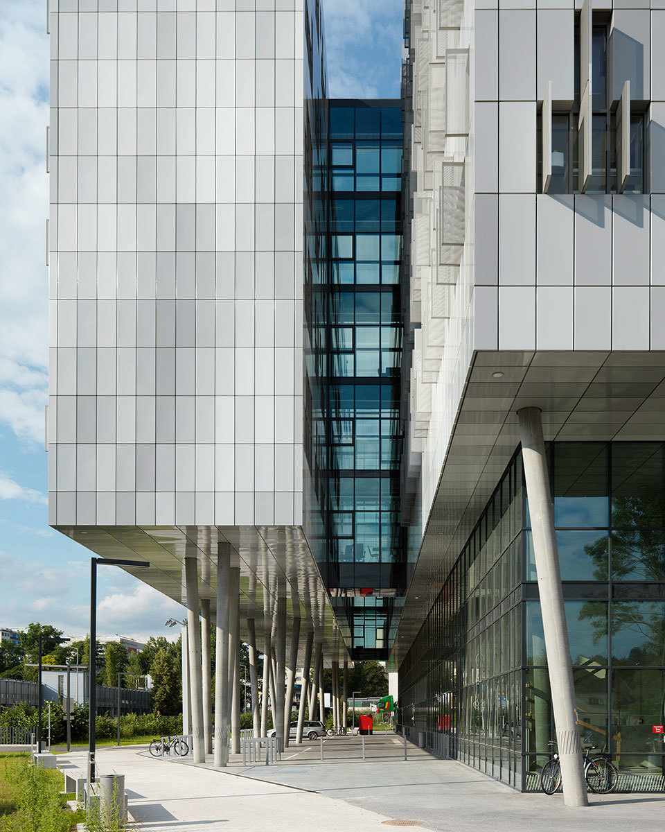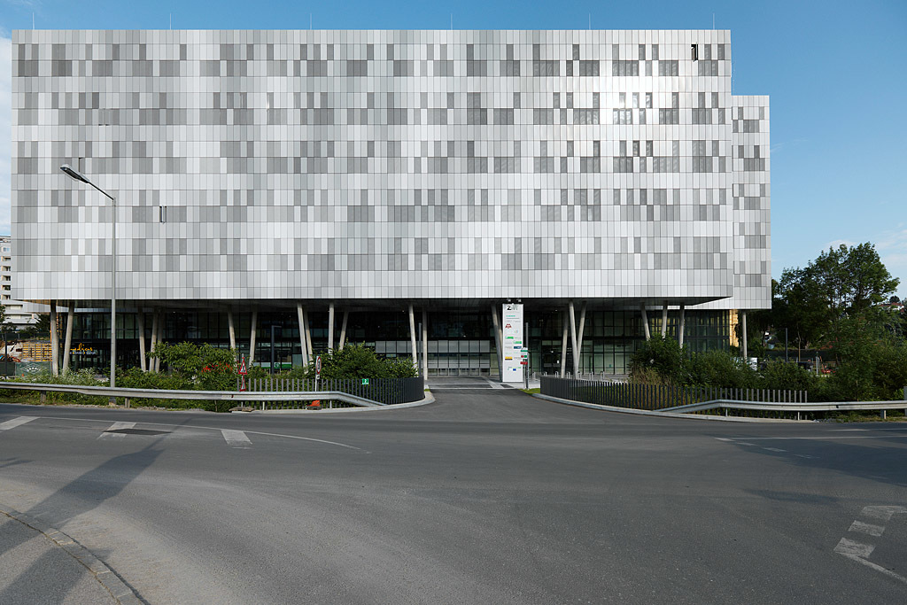 Baulich undefiniert ist der Beginn der Stiftingtalstraße heute. Einzelne, einander fremde Baukörper prägen das Bild. Die baulichen Notwendigkeiten des MED CAMPUS Graz docken räumlich an diese Heterogenität an. Riegler Riewe überbauen Bruchstellen, verdichten bislang undefinierte Bereiche, spannen auf mehreren Ebenen bisher nicht existierende Wegeverbindungen. Im Entstehen: unterschiedliche Volumina, neue Zugänge, verbindende Brücken. In einer Sprache die Außenhaut, das Erscheinungsbild des neuen Stadtteils. Die Fassadengestaltung des ZWT lässt das von Riegler Riewe gestaltete Gesamtkonzept erahnen und gibt gleichzeitig Rätsel auf: Was ist es, was man sieht? Wolken? Begrenzungen? Irritation. Kleinteilige Aluminiumtafeln in acht verschiedenen Grautönen überziehen die Baukörper und nehmen den Kuben ihr Volumen. Lassen sie, wenn er nicht mal ausnahmsweise blau ist, mit dem Himmel verschmelzen. Die farblichen Abstufungen vermitteln den Anschein Zeichen zu sein, die gelöst gehören. Der Blick bleibt konzentriert hängen. Drinnen wie draußen. Im Kleinen wie im Großen. (Text: Petra Kohlenprath)