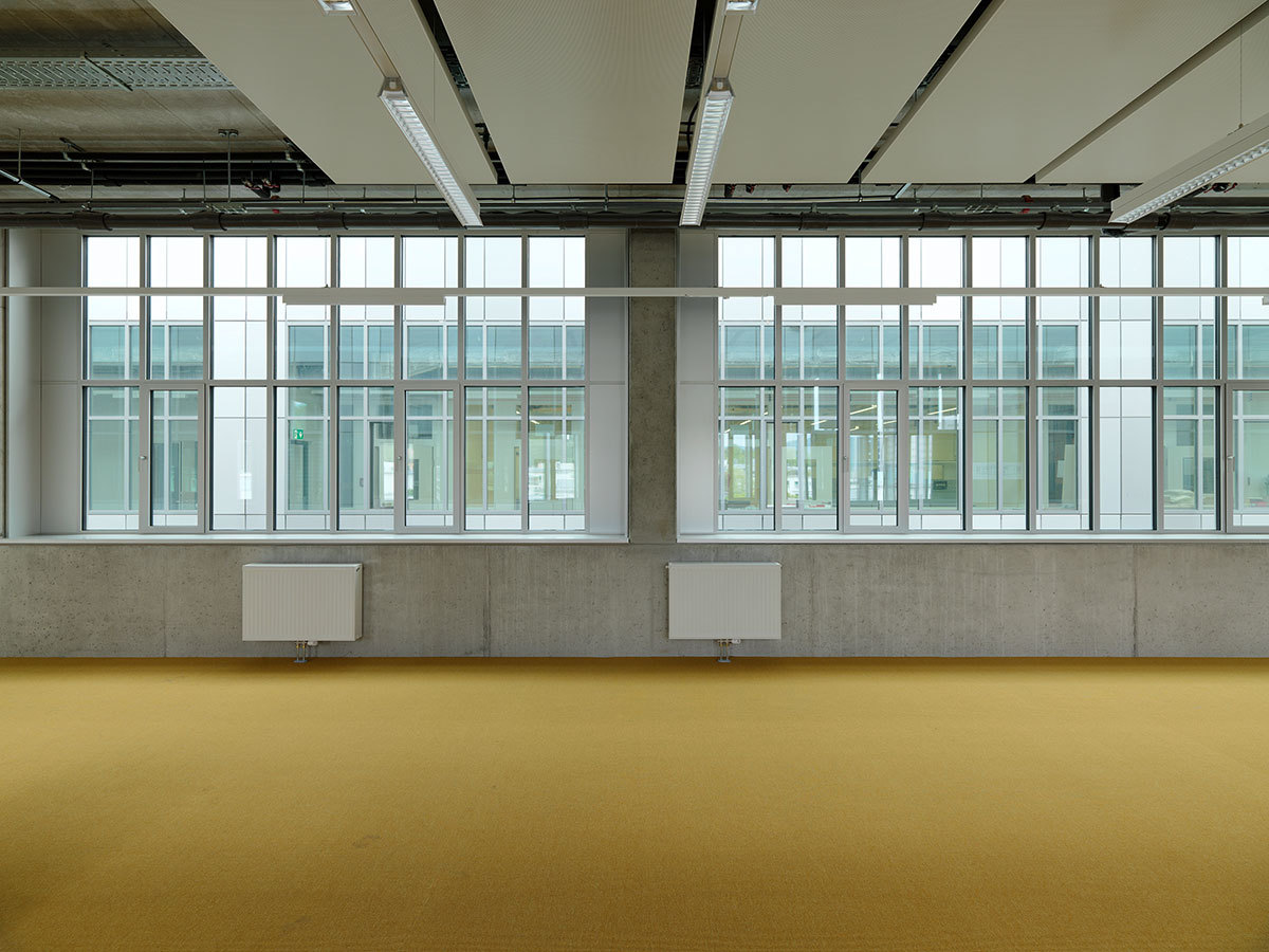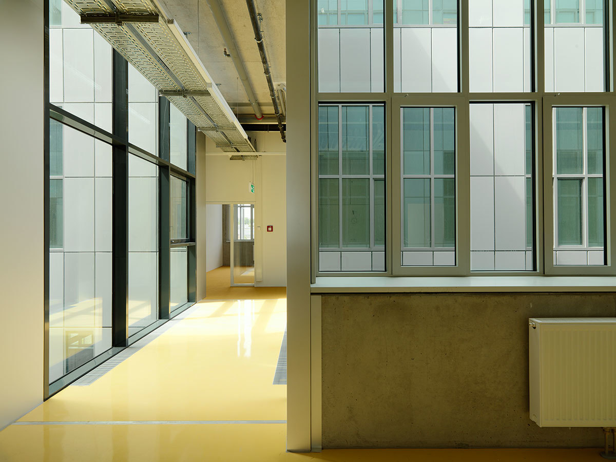 Riegler Riewe geben den funktionalen Ablauf mittels der baulichen Struktur vor. Es sind technische Installationen, die den Raum innerhalb seines Rasters rhythmisieren – unbestimmt bleibt seitens des Architektenteams die gestalterische Ausformulierung. Den Mieter:innen ist es überlassen, Raum zu Großraumbüros zusammenzuschließen oder kleine Arbeitseinheiten zu benutzen. Im Labortrakt geben Sicherheitsbestimmungen und funktionale Erfordernisse die Struktur an. Reduktion und Konzentration auf das für die Arbeit Wesentliche. Dafür: tiefe, auch als Ablage nutzbare Fensterbänke, Nischen in den Gangbereichen, mal als Garderobe, mal als Lagerplatz, dann wieder für technische Infrastruktur genutzt. Wieder bestimmen die Mieter:innen das Wie und Wofür. Vorgegeben lediglich die farbliche Gestaltung des Bodenbelags.