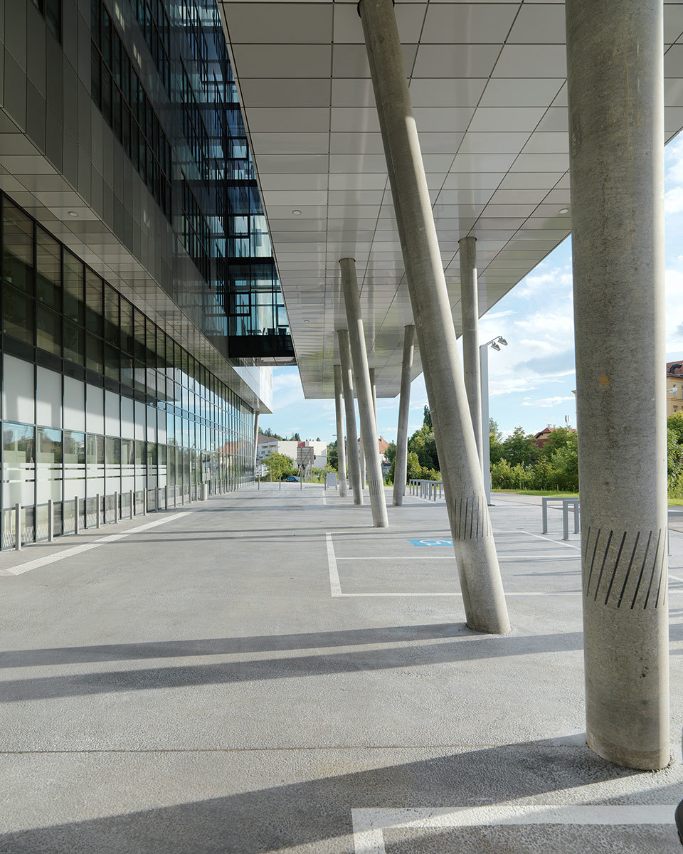 Das ZWT bildet den ersten Bauabschnitt des von Riegler Riewe geplanten MED CAMPUS Graz. Am Gemeinsamen arbeiten, Kommunikation ermöglichen, Schnittstelle sein. Im Besitz der Steirischen Wirtschaftsförderung und der Medizinischen Universität Graz, gibt das ZWT Start-Ups und bestehenden Forschungsunternehmen Raum. Mit der Möglichkeit zum direkten gegenseitigen Austausch, eingebunden in den Ort der medizinischen Lehre und Praxis.Zwei langgezogene, aufgeständerte, schlanke Kuben. Im Erdgeschoß, hinter einer großflächigen Glasfassade öffentliche Nutzungen, die weiteren Geschoße geschützt vor Einblick von außen, nichts vom Geschehen im Inneren preisgebend. Als reiner Bürotrakt der eine Baukörper, der parallel dahinter liegende vorwiegend für Labor- und Forschungszwecke strukturiert. An zwei Stellen führen Zugänge ins Innere – nach oben – 3,80 Meter Raumhöhe – aufgrund der technischen Anforderungen in den Laborräumen – auch im Bürotrakt. Großzügigkeit.