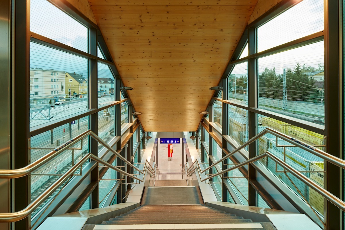 Die Aufgabe, bei laufendem Bahnbetrieb eine so lange Überbrückung eines Gleiskörpers aufzubauen, war sicher eine Herausforderung. Den Skywalk als einseitig offenen Kastenträger in Brettsperrholz auszuführen, noch dazu als mehrfach geknickte Holzbrücke hoch über den Gleisanlagen, kann als Pionierleistung von Ingenieur und Architekt gewertet werden. Die hohen statischen Anforderungen an die Tragkonstruktion, die nur an den Abgängen zu den Bahnsteigen aufliegt, erahnt man, die saubere Ausführung der vorgefertigten, mittels Kran eingehobenen und verbundenen Elemente kann man auf Schritt und Tritt sehen.