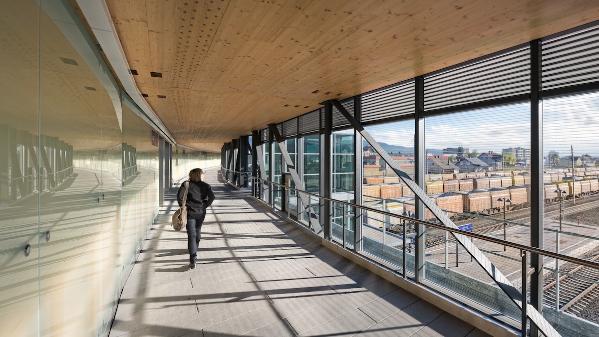 Auf der geschlossenen Seite wird das Holz innen durch satinierte Glasplatten geschützt, die das Material durchschimmern lassen. Die Decke bleibt unverkleidet. Dann gibt es noch den eindrucksvollen Panoramablick über die Gleise hinweg ins Murtal und man versteht, warum in dieser Region Holz, selbst für eine Bahnbrücke und Bahnsteigdächer, das neue Image eines Bahnhofs prägen soll.