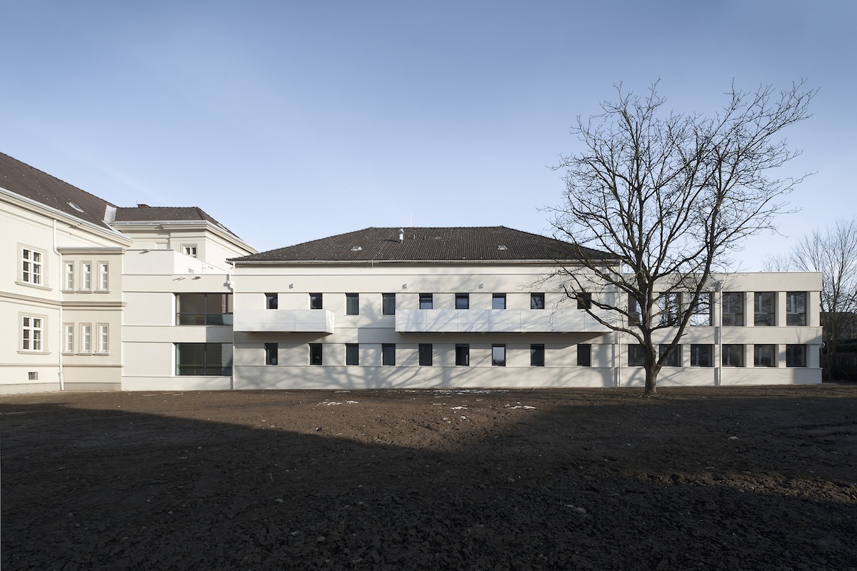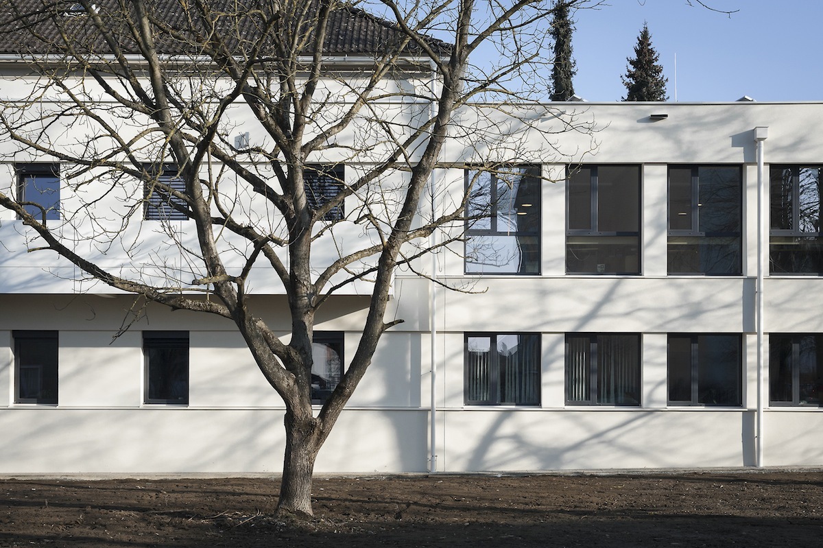 Zur Vergrößerung des Raumprogramms wurde nun der Trakt aus den 70er Jahren um etwa die Hälfte seines Volumens gegen Süden hin erweitert, wobei das Satteldach des älteren Gebäudes erhalten blieb, während der Neubau flach gedeckt ist und damit gegenüber dem Altbestand als solcher sichtbar bleibt. Hinsichtlich der symmetrisch angelegten Raumaufteilung auf zwei Geschoßen, und aufgrund der geforderten Distanz zu den anliegenden Grundstücken, ist die Südfassade leicht nach innen geknickt.