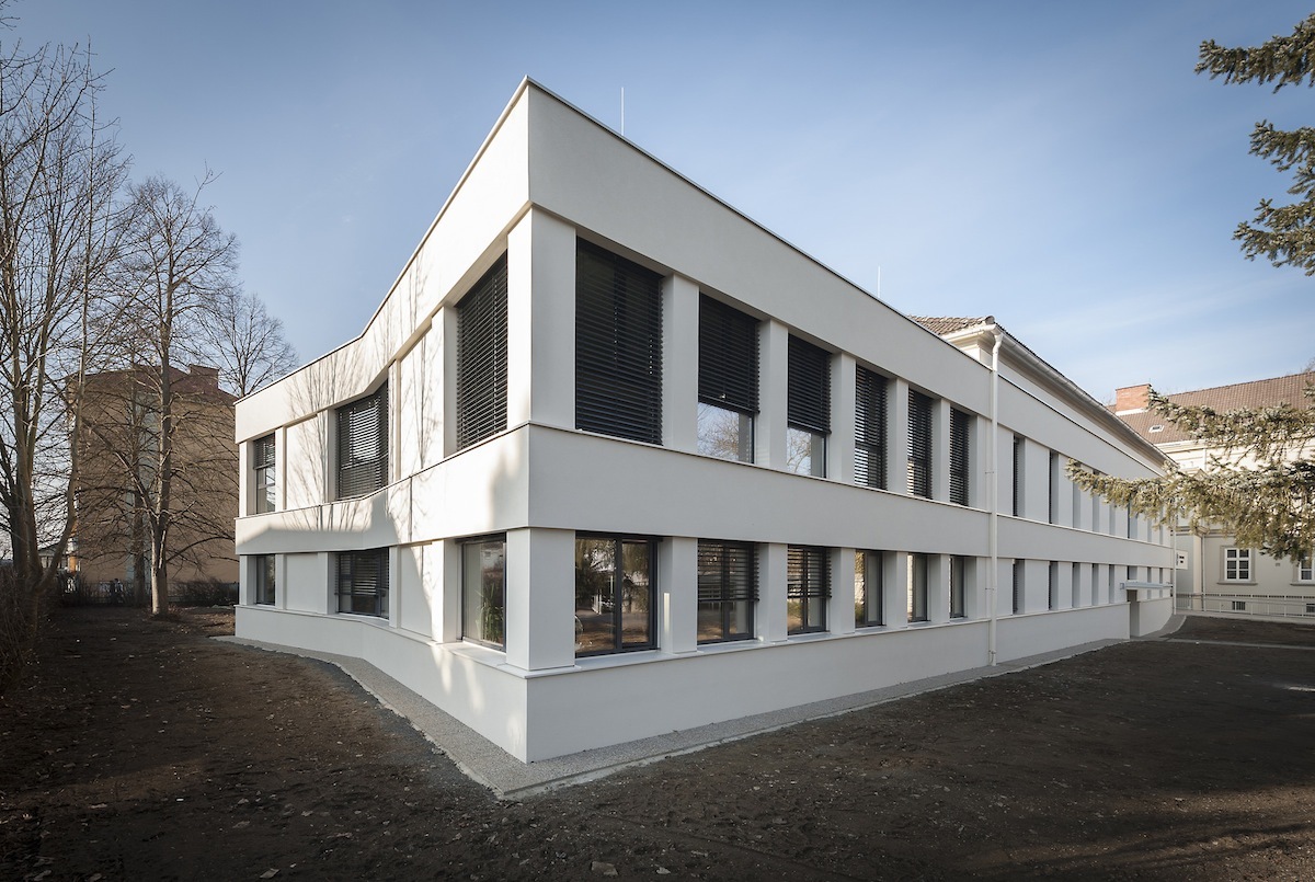 Beim Blick auf die Fassade dagegen erschließt sich die Unterscheidung zwischen Altbestand und neuem Zubau klar. Dennoch wird die optisch physische Verbindung zwischen beiden Gebäudeteilen durch einheitliche Farbgebung bzw. erhabene, verbindende Fassadendetails erreicht.