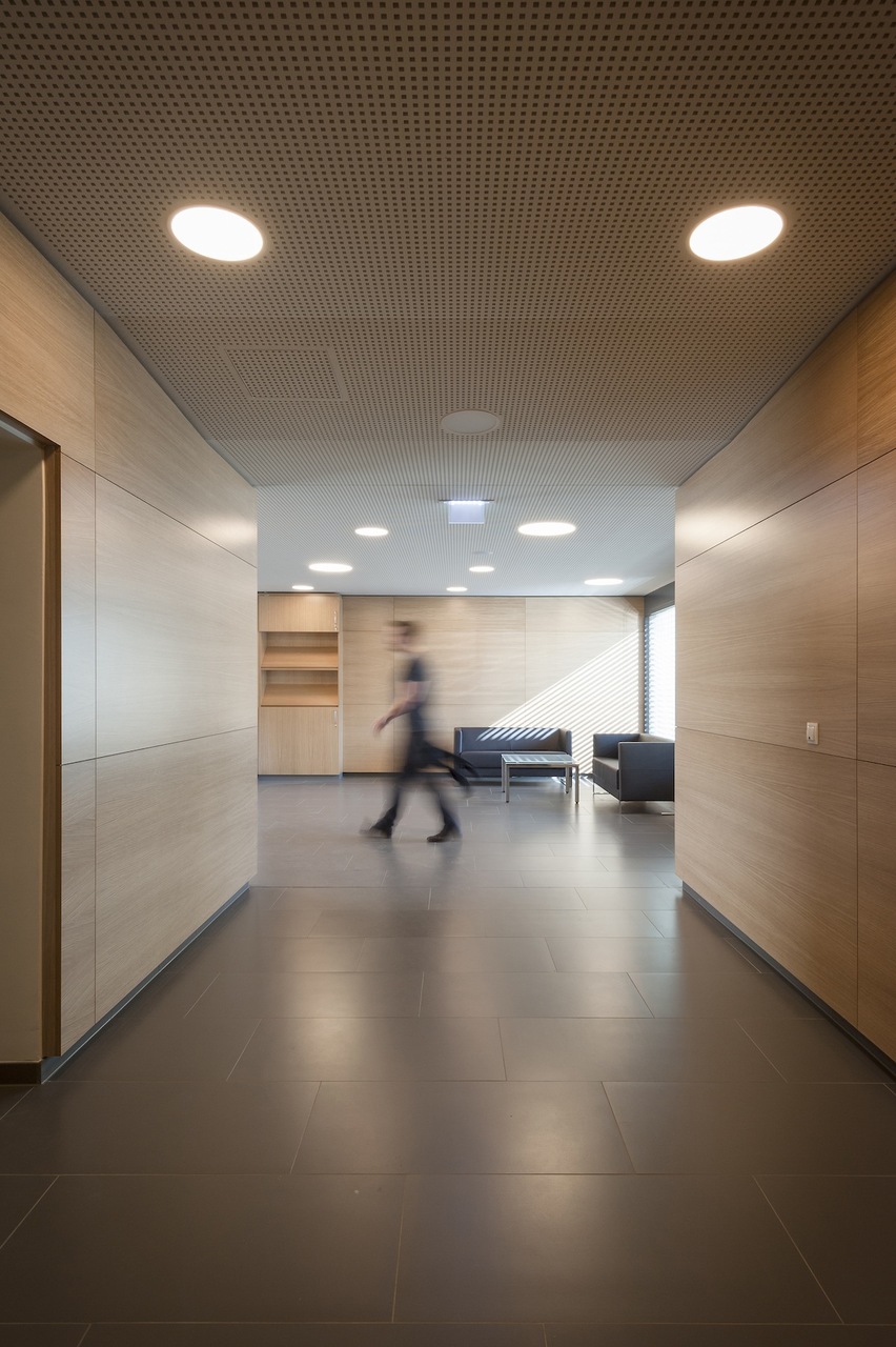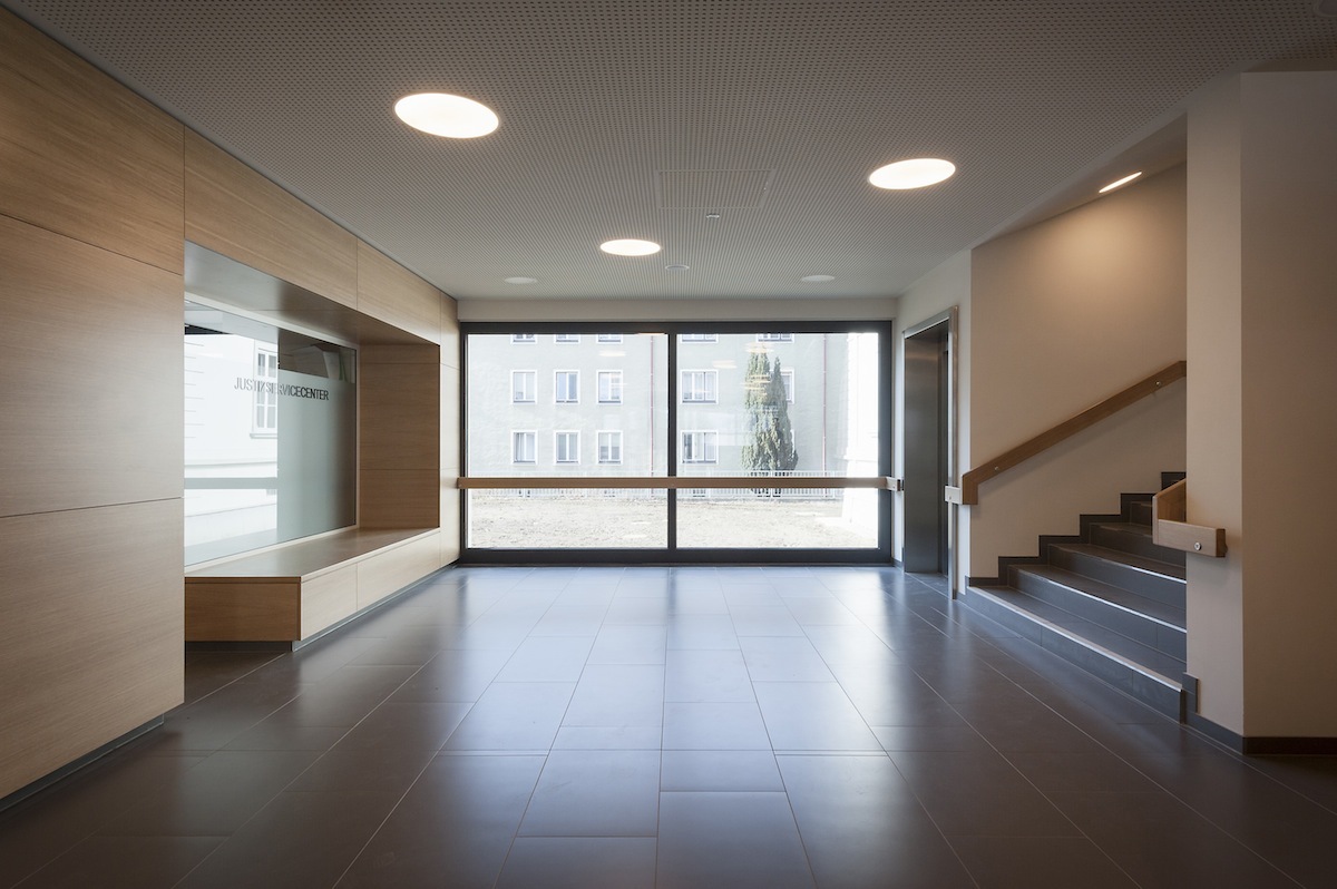 Vor allem die neuen Sicherheitsrichtlinien für Amtsgebäude wie auch die Einrichtung bisher nicht bestandener Servicefunktionen waren maßgebliche Kriterien für die Gestaltung des Eingangsbereiches. Die Glasfront in der Breite der Zugangsrampe öffnet sich linkerhand zur Zugangskontrolle mit Holzvertäfelung, zu der auch ein von der Rampe herreichendes, im Boden eingelassenes taktiles Leitsystem führt. Einlaufstelle und Sicherheitsschleuse in transparenter Ausführung bilden eine Schwelle, einen Riegel zum zentralen Warte- und Verteilerraum des Eingangsbereiches, der über einen Gang nach links in den um- und zugebauten Bereich der Räume für Archiv- und Rechtspflegezimmer führt. Gegenüber öffnet sich dieser Raum einem neu angelegten Treppenhaus, über das man wiederum in den historischen Teil des Amtsgebäudes gelangt. Ebenfalls in diesem Bereich, und hinter der Sicherheitsschleuse gelegen, befindet sich das am Bezirksgericht Feldbach neu eingerichtete Justiz-Servicecenter, das sich schon optisch durch die semitransparente Glasfront als klientenfreundlich darstellt. Das Servicecenter bietet Hilfe bei der Orientierung im Justizbetrieb und ist so konzipiert, dass die am häufigsten nachgefragten Leistungen zentral und sofort erledigt werden können.