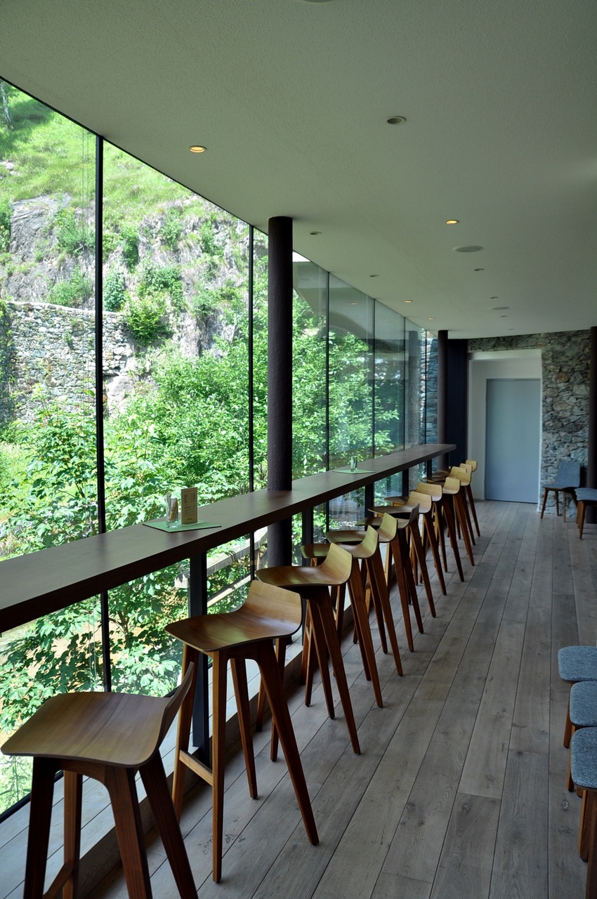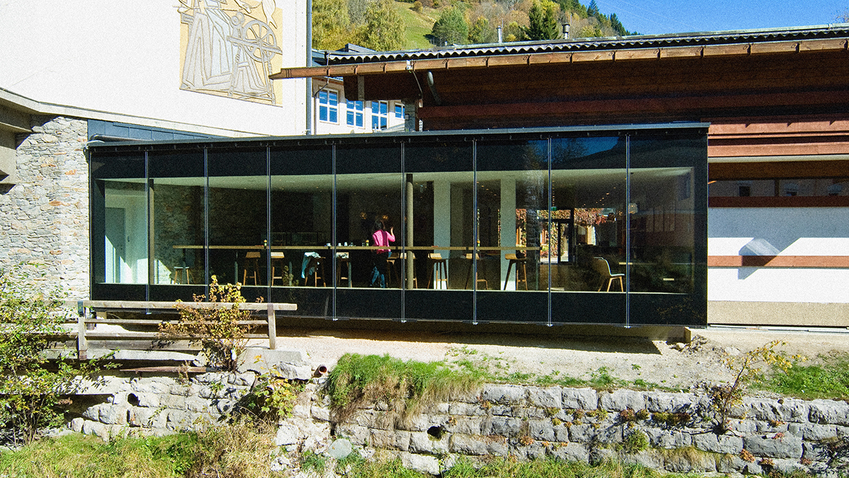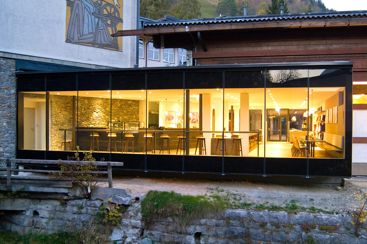 Die letzte Station der Führung bildet der neu errichtete Store mit Café, der zwischen der Fabrik und einem bestehenden Geschäft aus den 70er-Jahren eingeschoben wurde und diese Gebäudeteile verbindet. Auf einer rundum stark auskragenden Stahlbetonplatte wurde eine Grundkonstruktion aus Stahlgerüst und Massivholzplattendecke errichtet, welche aus Schallgründen von der Fabrik entkoppelt wurde. Richtung Südwesten hin wurde der Baukörper bodeneben und über die gesamte Gebäudebreite verglast und gibt so den Blick auf das Tal und den Fluss Mandling frei. Entlang der Fassade sind Sitzmöglichkeiten angeordnet, die zusammen mit einer freistehenden Theke das Café des Zubaus bilden, welches Richtung Osten zum Eingang hin in einen Verkaufsraum übergeht.