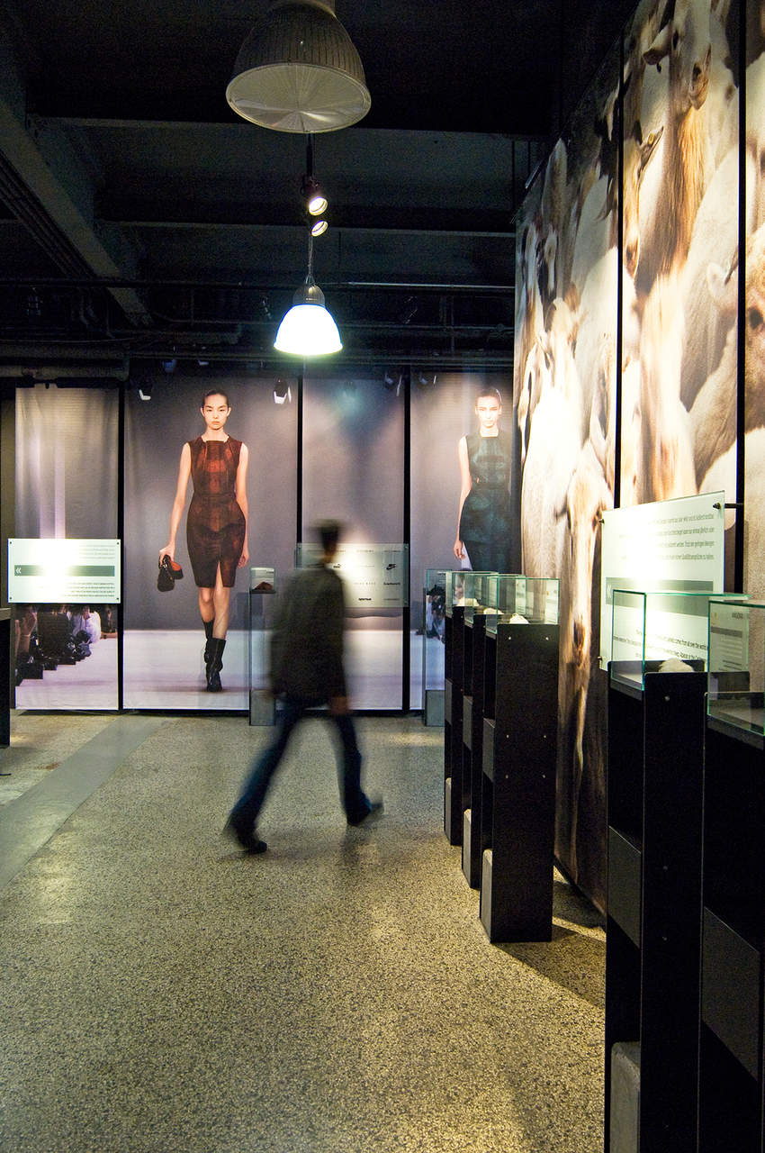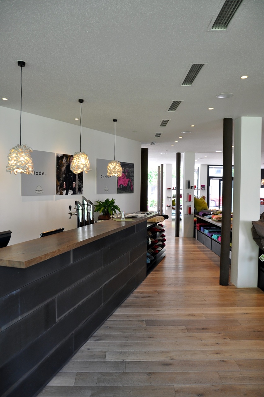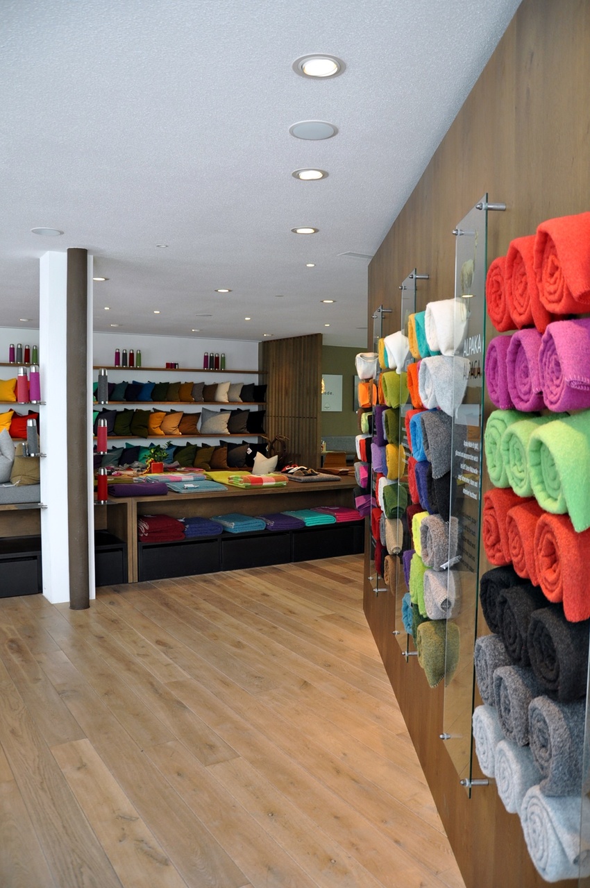 Im Inneren dominieren natürliche Materialien in Erdtönen und eine geradlinige Architektur, die ein schlichtes Grundgerüst für die ausgestellten Produkte bietet und diese in Szene setzt. Das Thema Wolle wird im Design der Einrichtungsgegenstände, wie etwa den Lampenschirmen, aufgegriffen.