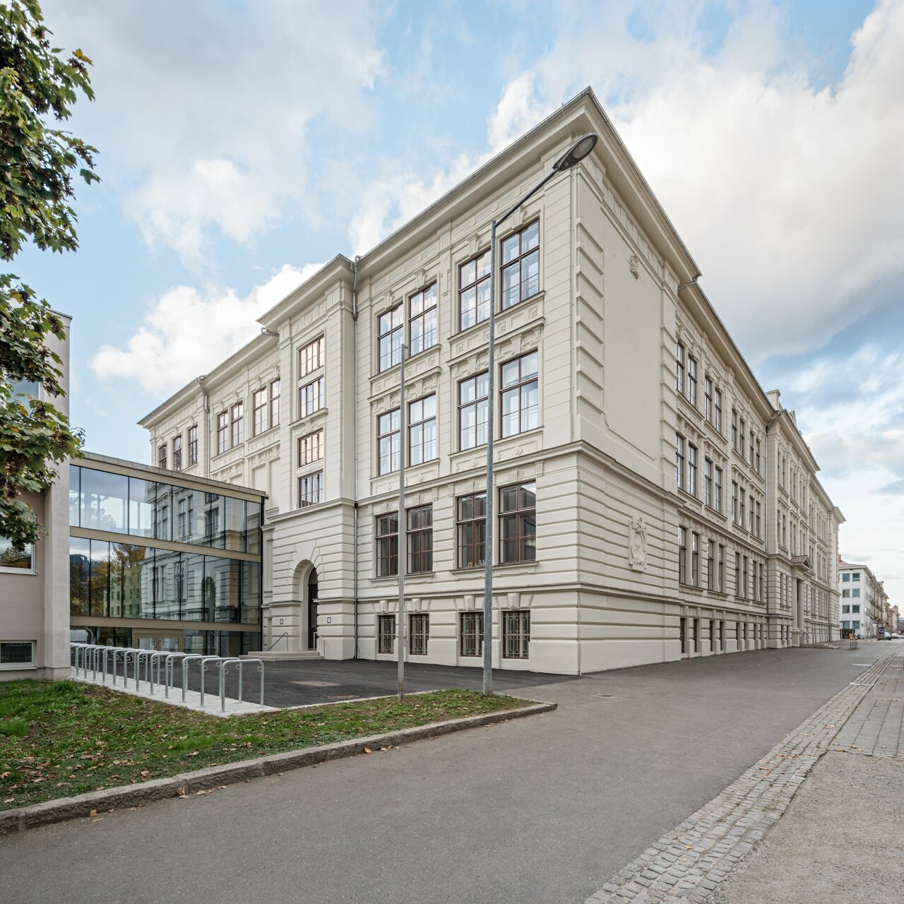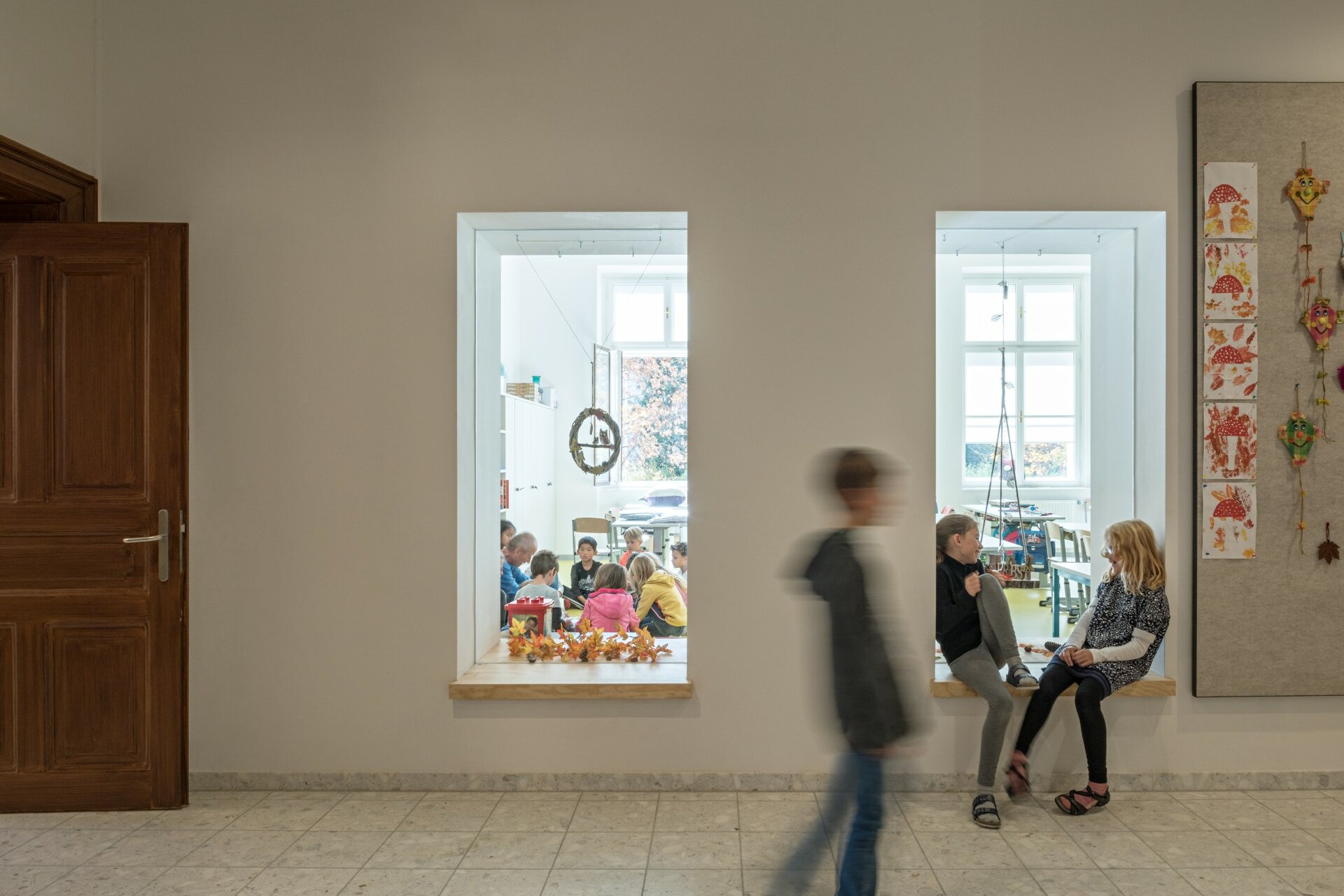 Der denkmalgeschützte Altbestand der 1904/05 erbauten Schule konnte in seiner Substanz belassen werden, der Abbruch der Schulwarthäuschen und Sanitäranlagen schafft mehr Platz und Transparenz. Der so entstehende Raum zwischen dem denkmalgeschützten Klassentrakt und dem Turnsaalgebäude wurde mit großzügigen und zum Garten geöffneten Gemeinschaftsflächen gefüllt. Die abgetreppten, verglasten Bereiche mit teilüberdachten Balkonen bieten den Kindern großzügige gemeinsame Freiräume mit Blick auf die alte Stadtwiese. Das Gesicht der Schule mit dem neuen Haupteingang orientiert sich nun zum Grünen.
