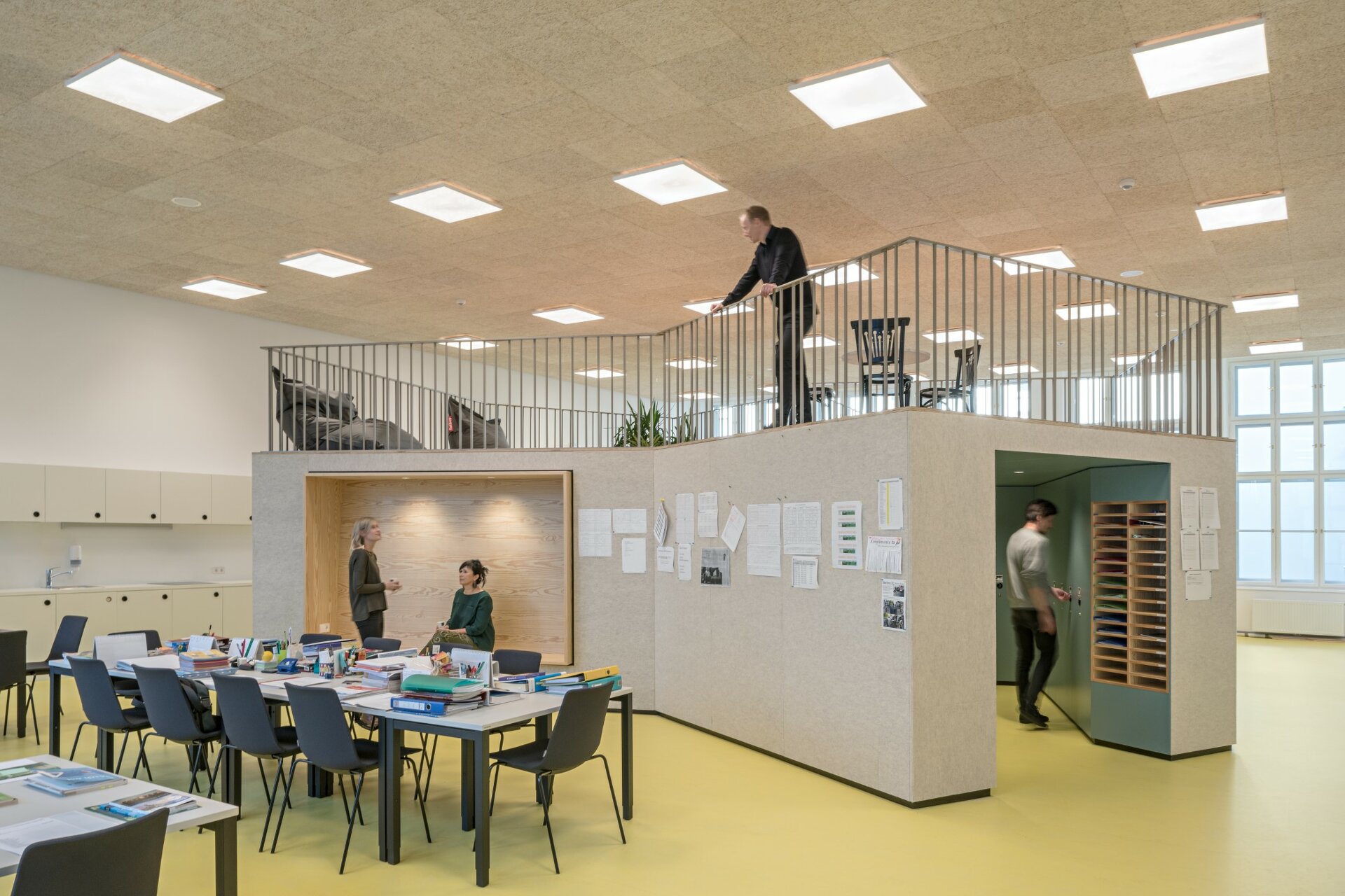 Bereits in der Wettbewerbsphase diskutierten die 70 Lehrer:innen der beiden Schulen in Workshops mit den Architekt:innen über Wünsche, Bedürfnisse und deren Umsetzbarkeit. Ein kooperativer Prozess, den Franz&Sue in der Planung weitergeführt hat.