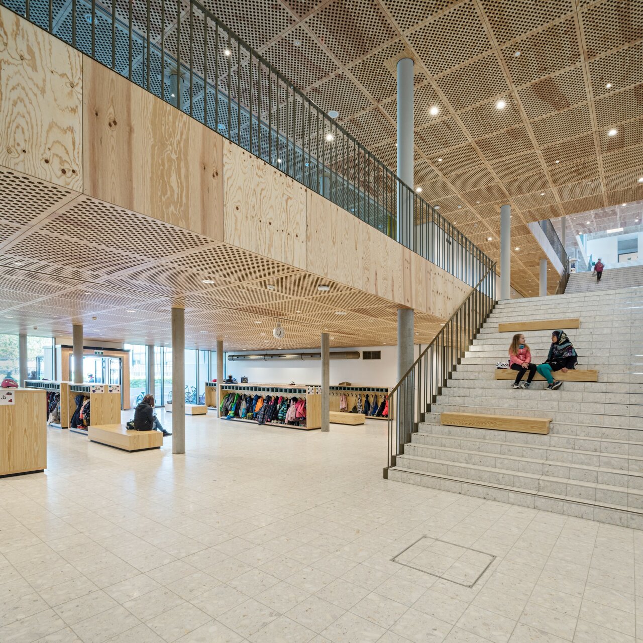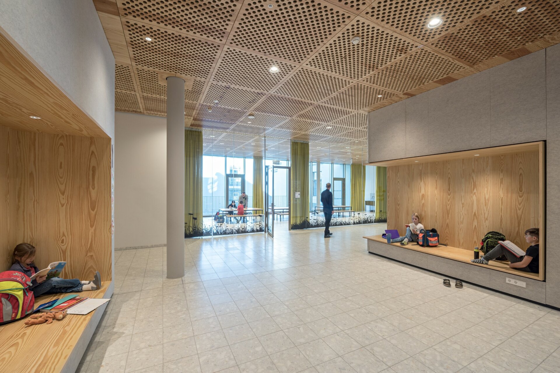 Aus dem ehemaligen Keller wird durch Abgraben ein Erdgeschoss mit einem hellen, offenen Foyer und direktem Zugang zur Wiese. Von hier aus können sich die Schüler:innen einfach orientieren und schnell überall hingelangen. Mit den Garderoben in der Lernlandschaft, der Bibliothek und dem Veranstaltungsraum entsteht ein neuer, sozialer Kern.
