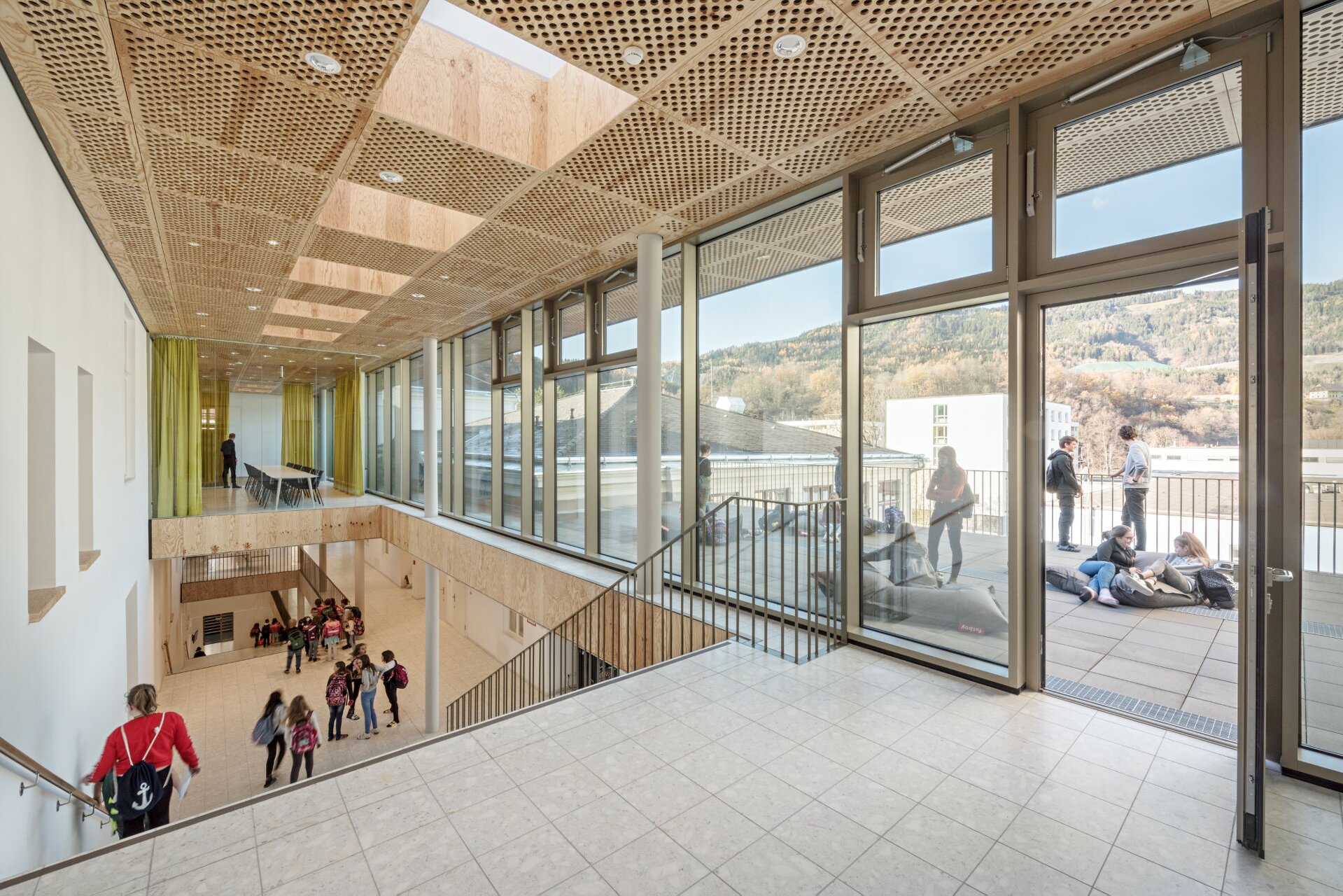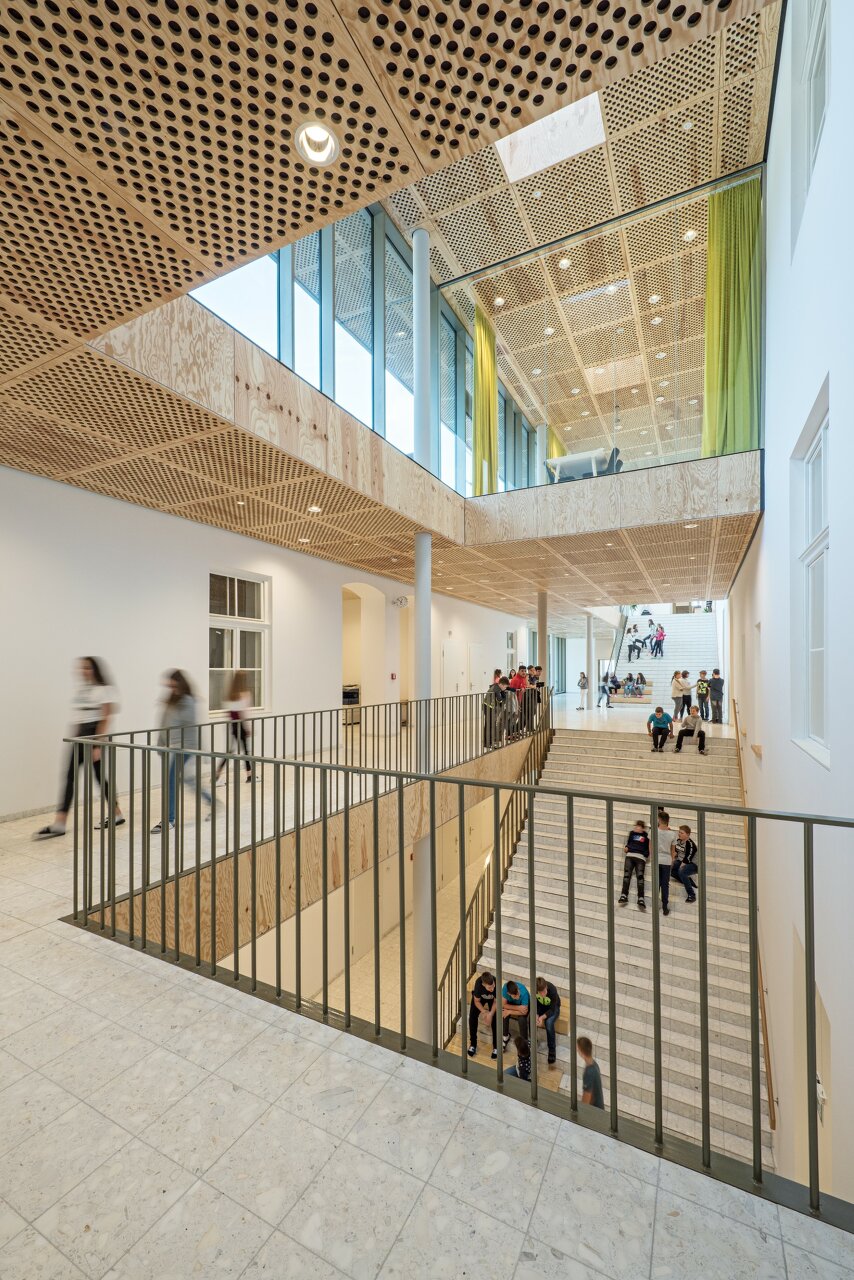 Diese kommunikative Grundhaltung des Bildungszentrums sieht man am deutlichsten an der zentralen Treppe, die alle vier Stockwerke verbindet und mit den Lufträumen dazwischen das Herz der Schule bildet. Lange, dunkle Gänge und tote Winkel werden durch mobile Gangmöbel, Innenwände mit Fenstern, Sitznischen und transparente Gruppenräume ersetzt. Kleine und größere Transformationen im Innern – das sonnige Farbspektrum oder die gelochten Seekieferdecken mit Sternenhimmel-Beleuchtung – tragen zur offenen und freundlichen Atmosphäre bei, die man beim Betreten der Schule spürt. (Text: Architekten, bearbeitet)