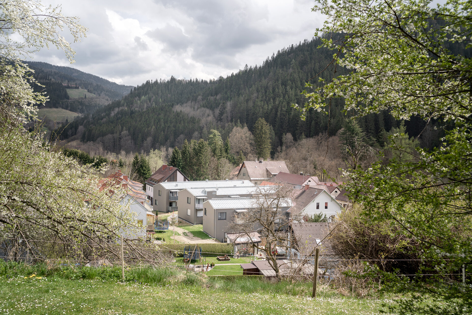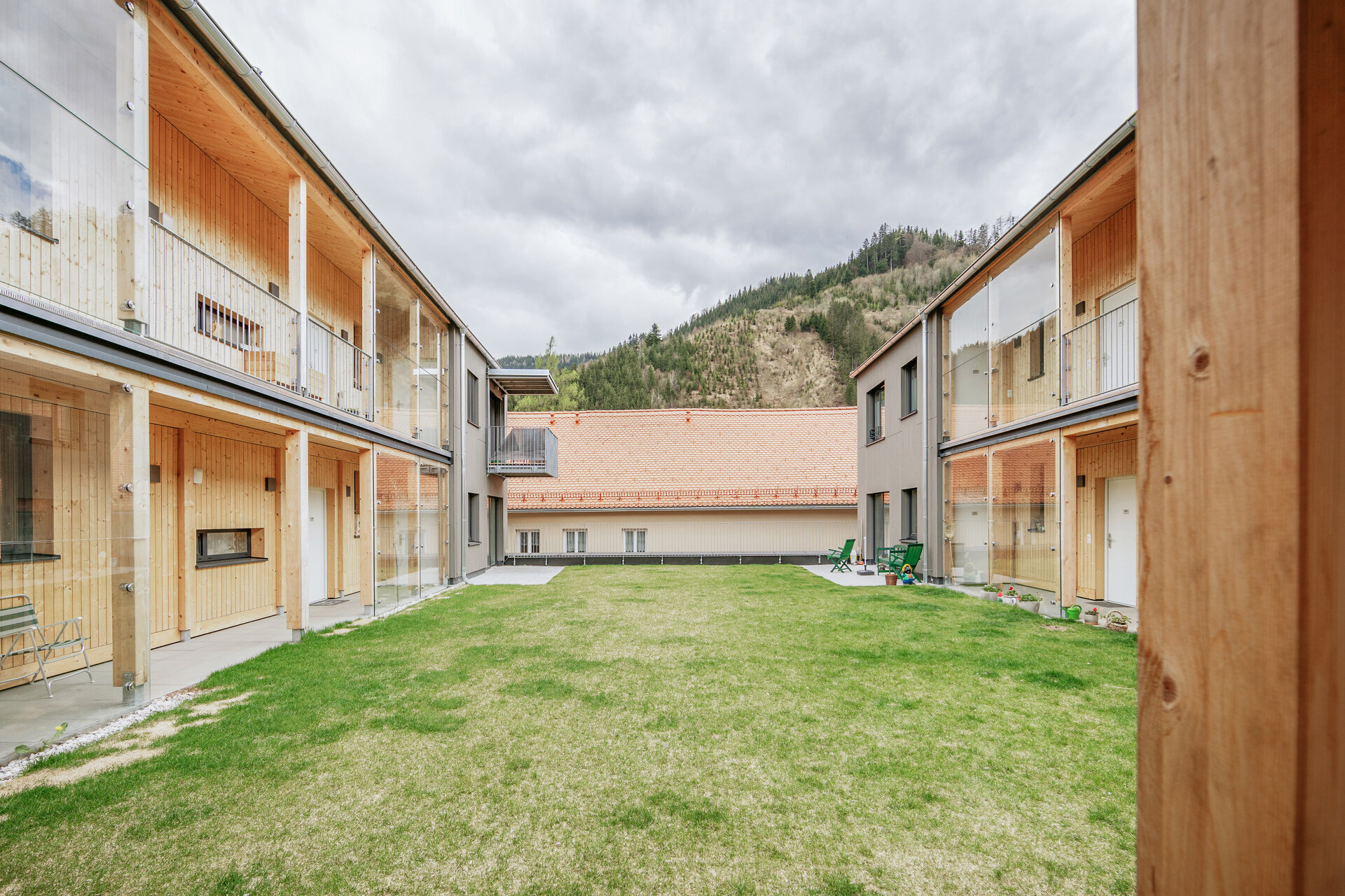 Unterschiedlichste Anforderungen, die komplexe Topografie und der baufällige Altbestand erforderten eine Mischung aus Sanierung, Abbruch und Neubau. Durch die Trennung des Haupthauses und des „Sewerahauses“ am Platz wurde ein wichtiger erster Schritt getan. Die Platzsituation hat sich dadurch stark verändert. Das Ensemble bekommt durch die entstandene Fußgängerzone urbanen Charakter. Wo früher ein leerstehender ADEG-Markt war ist nun ein neuer Nahversorger. Auf dessen Flachdach liegen zwei Baukörper mit Satteldach wo 16 Wohnungen Platz finden. Der dritte neue Baukörper ist der Gemeinde zugeordnet. Der Hauptplatz mit den Geschäftslokalen, das Gemeindeamt mit dem neuen Saal und sämtliche neuen Wohnungen sind über eine zentrale Erschließung mit Liftanlage barrierefrei verbunden. Den Wohnungen sind Freibereiche im gemeinsamen Innenhof (am Dach des Nahversorgers) angeschlossen. Diese Hoftypologie ermöglicht den Ausblick der nördlich angrenzenden Wohnbebauung, die Ost-West-Orientierung der Wohnungen und eine durchgesteckte Grundrisstypologie. Die Neubauten über dem Sockelgeschoss wurden in konstruktivem Holzbau errichtet.