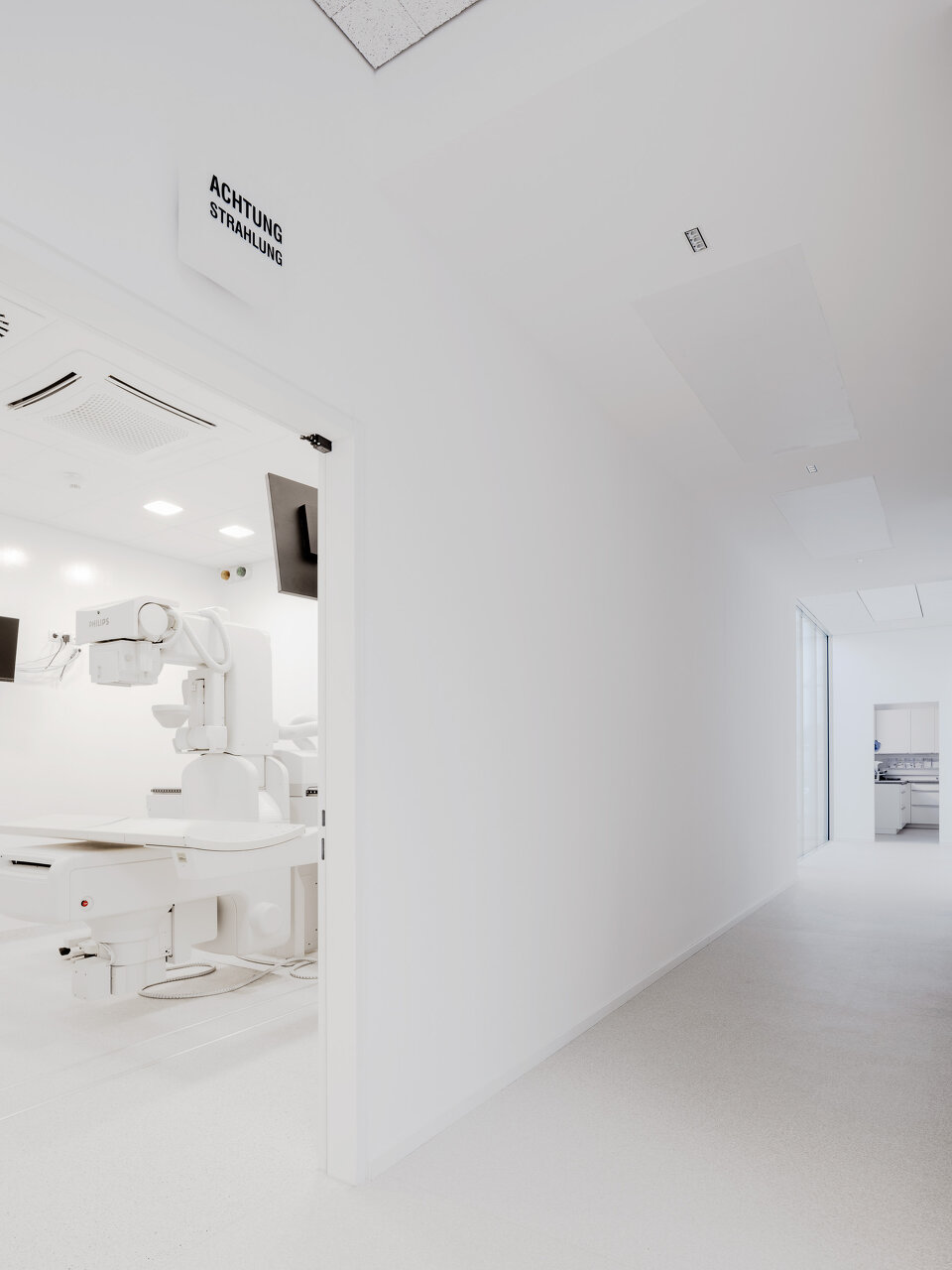 Vom Besucherparkplatz im Süden gelangt man in den großzügigen, offenen Warteraum. Dieser wird von einem Band aus Ordinationsräumen gesäumt, welche über zwei verglaste Atrien von innen natürlich belichtet werden. Dahinter bildet ein zentraler lichtdurchfluteter Versorgungsgang die Schnittstelle zum Rest der Klinik. Hier befinden sich Räume mit moderner medizintechnischer Ausstattung für Röntgen, Ultraschall, Endoskopien, Schnittbilduntersuchungen (CT und MRT), Labordiagnostik, onkologische Behandlungen, sowie zwei Operationsräume für klassische und minimalinvasive chirurgische Interventionen.