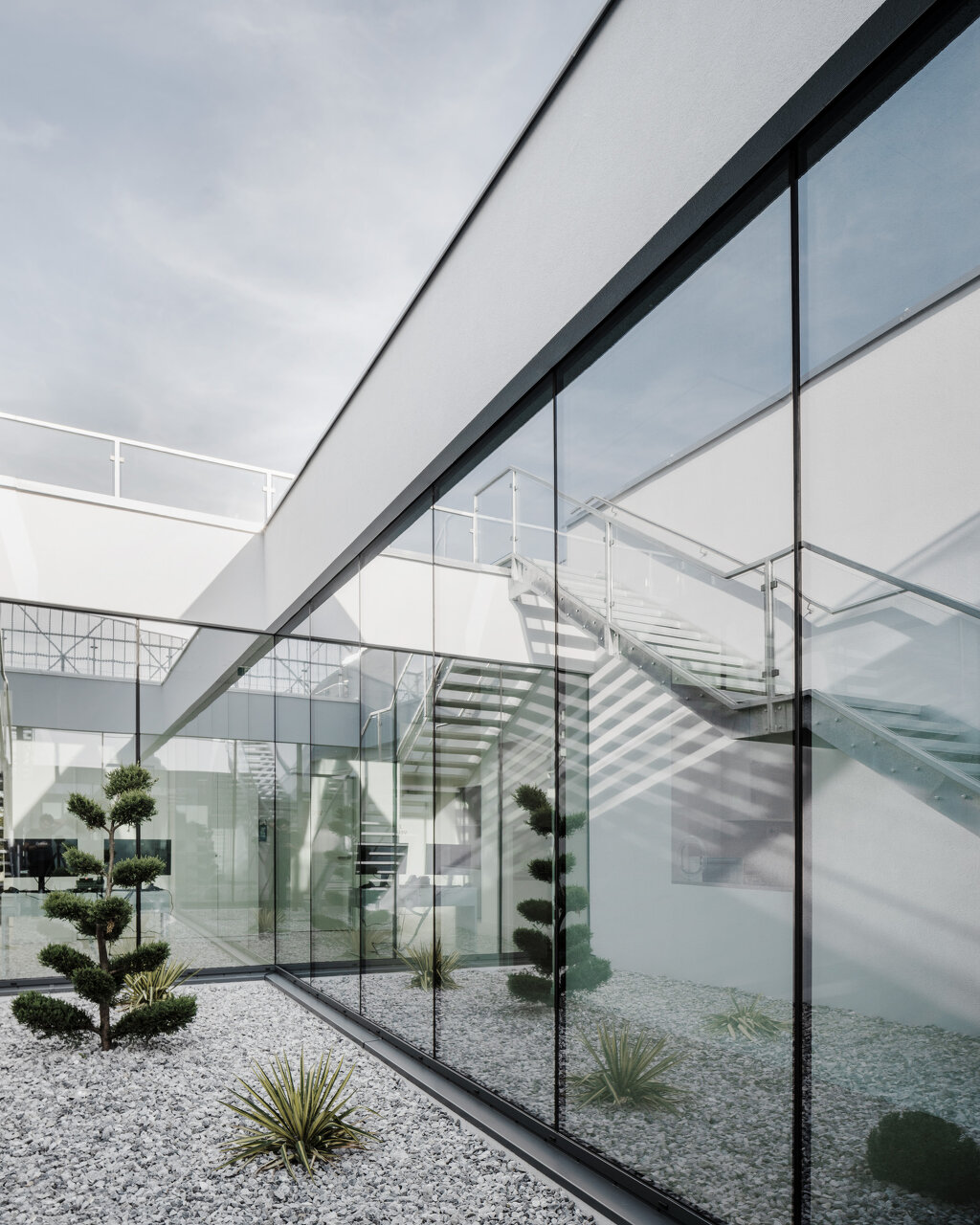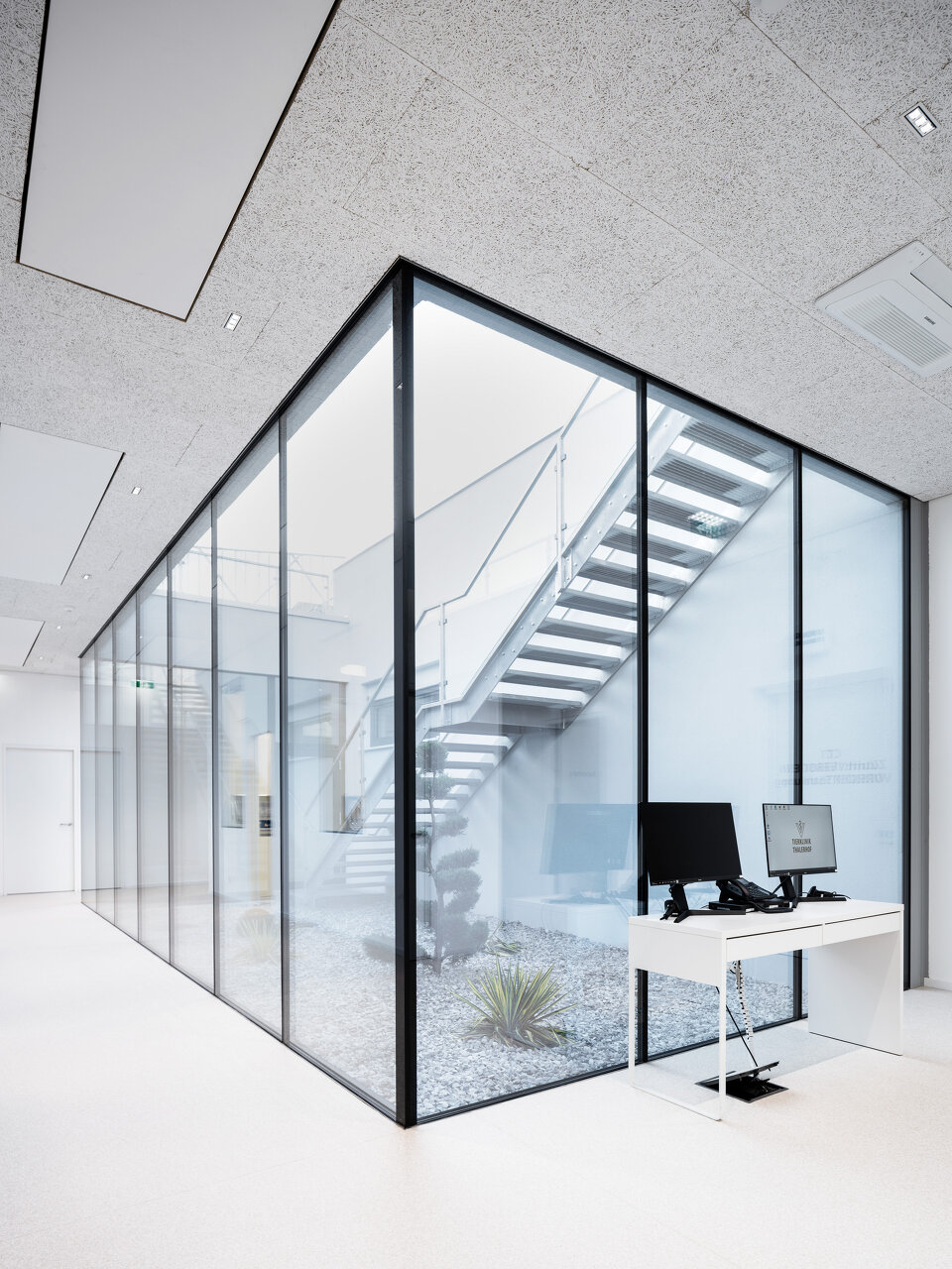 Im Obergeschoss, welches in einer zweiten Bauetappe errichtet wurde, sind die über einen Lift barrierefrei erreichbaren Büro- und Seminarräumlichkeiten situiert. Das extensiv begrünte Dach wird für Physiotherapie genutzt.